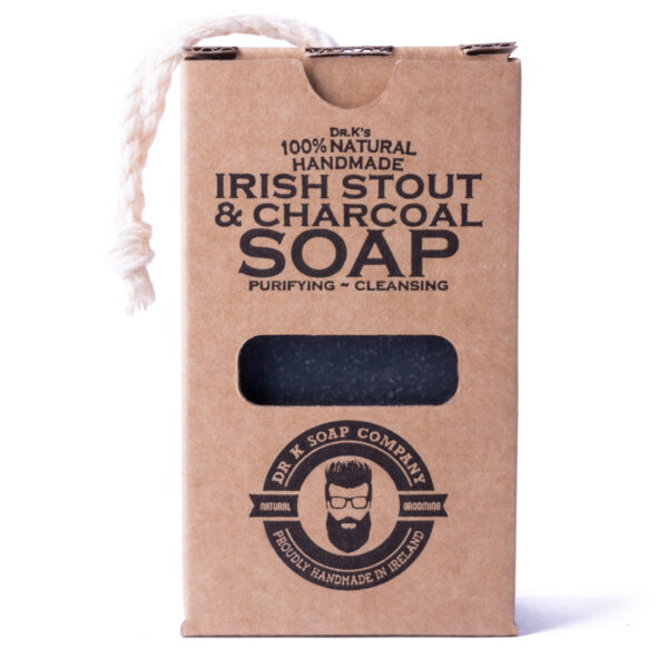 Dr K Soap Irish Stout & Charcoal Soap - to irlandzkie mydło bezzapachowe do ciała z dodatkiem Irish Stout (irlandzka marka piwa) do tworzenia bogatej piany oraz oczyszczającej mocy aktywowanego węgla drzewnego. Mydło posiada bawełnianą linkę umożliwiającą odwieszenie produktu po użyciu.100% naturalne i ręcznie robione mydło wegańskie bez sztucznych dodatków, konserwantów. Nie testowane na zwierzętach.Opakowanie: 110 g po zapakowaniu. Pakowany w całkowicie nadający się do recyklingu / biodegradowalny karton.Skład: Sodium Palmate (Sustainable), Sodium Olivate, Sodium Cocoate, Sodium Sunflowerate, Sodium Castorate, Sodium Cocoa Butterate, Irish Stout, Activated Charcoal, Cotton Rope