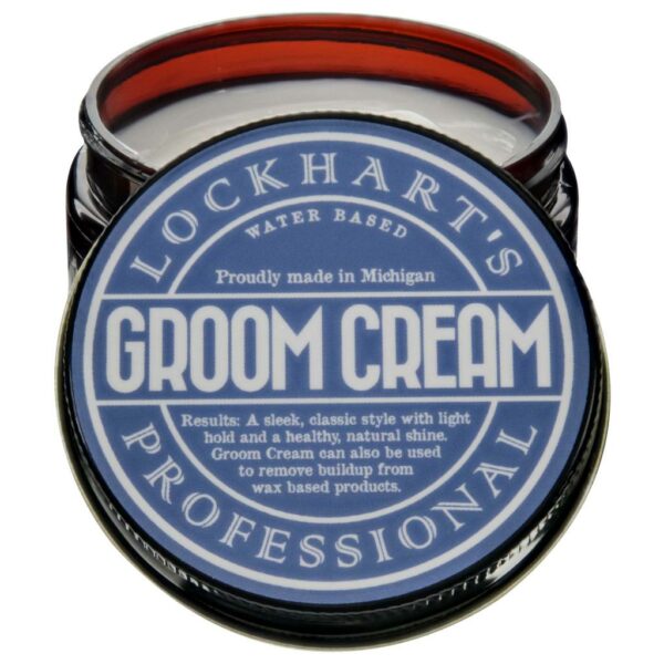 Lockhart's Proffesional Groom Cream - najbardziej uniwersalny produkt marki Lockharts.Groom Cream to definicja produktu "all in one". Jego najważniejszym zadaniem jest wsparcie w zmywaniu pomad woskowych, w takim celu stworzono ten krem. Wystarczy nałożyć go na uformowaną fryzurę i pozostawić na kilka minut, krem zareaguje z woskiem i we wsparciu szamponu i ciepłej wody pomoże pozbyć się wosku z włosów. To doskonała alternatywa dla agresywnych degreaserów i świetne rozwiązanie dla mężczyzn z suchymi włosami.Groom Cream to jednak zdecydowanie więcej niż zwykły degreaser. To jednocześnie świetna pomada dla rozpoczynających swoją przygodę ze stylizacją, ma lekki chwyt i naturalny połysk. Bazuje na wodzie więc łatwo go zmyć i wprowadzić w fryzurę. W składzie ma przede wszystkim wodę, olejek z awokado, ekstrat z liści rozmarynu i ogórka, dlatego bez obaw można go stosować również na brodę czy skórę rąk. W przypadku brody będzie doskonale ujarzmiał nawet najbardziej niesforny zarost a dla suchych i zniszczonych dłoni będzie doskonałą ochroną przed pękaniem naskórka czy zmianami temperatur zimą oraz latem.Charakterystyka pomady:Lekki chwytNaturalny połyskKremowa teksturaZapach bergamotki i mandarynki.Zastosowanie Groom Cream Lockharts'a:Degreaser dla woskowego build up'u - wystarczy wprowadzić krem w fryzurę postawioną na woskowej pomadzie na 5 minut i pozwolić mu rozpuścić wosk. Po takim zabiegu wystarczy zmyć włosy szamponem.Pomada o lekkim chwycie i małym połysku.Balsam do stylizacji brodyTopper do fryzur na pomadach woskowych - niewielka ilość rozświetli odpowiednio fryzurę.Odżywka bez zmywania. Naniesiona na świeżo umyte i wilgotne włosy doskonale je odżywi i wzmocni.Krem do dłoni, zwłaszcza dla tych wyjątkowo zniszczonych i wysuszonych. Pojemność: 35gSkład: Water (aqua), Cocos nucifera (cocnut) oil, beeswax (cera alba), persea gratissima (avocado) oil, btyrospermum parkii (shea butter), PEG-40 hydrogenated castor oil, ceteareth-20, cetyl alcohol, stearyl alcohol, polysorbate-60, phenoxyethanol, sorbic acid, citrus tangerina (tangerine) oil, citrus bergamia (bergamot) fruit oil, glycerin, cucumis sativus (cucmber) fruit extract, rosmarinus officinalis (rosemary) extract.