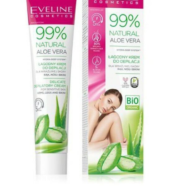 Eveline Natural Aloe Vera 99% Krem Do Depilacji 125MLDokładnie i skutecznie usuwa zbędne owłosienie pach, rąk, nóg i okolic bikini. Zawiera nawilżający i łagodzący podrażnienia aloes.