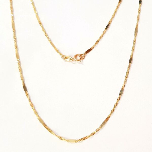 Złoty łańcuszek o efektownym splocie typu singapur, ozdobiony błyszczącymi blaszkami. Długość łańcuszka to 50 centymetrów, szerokość - 1 milimetr.