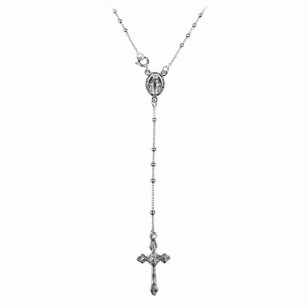 Srebrny różaniec z zawieszką w kształcie Jezusa na krzyżu. Wykonany jest ze srebra próby 925. Długość 48 cm plus przedłużka 10 cm