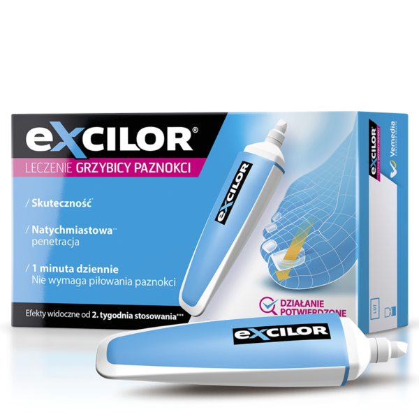Excilor® Leczenie grzybicy paznokci, sztyftPOJEMNOŚĆ: 3,3 mlDZIAŁANIE:Excilor® zmienia mikrośrodowisko paznokcia, zakwaszając łożysko paznokcia. Wykazuje zdolność wnikania w paznokieć, dzięki technologii TransActive, obejmując leczeniem cały paznokieć. Natychmiast obniża pH paznokcia, tworząc niekorzystne środowisko dla rozwoju grzybów.Jest wzbogacony w glicerol, którego cząsteczki przyciągają wodę.Ponadto zawiera lipidy pielęgnujące paznokcie oraz biotynę. Kombinacja tych składników zmiękcza, nawadnia i odżywia płytkę paznokciową.WSKAZANIA:Excilor® leczenie grzybicy paznokci w formie sztyftu to wyrób medyczny stosowany w leczeniu grzybicy paznokci. Jako jeden z niewielu na rynku, dzięki technologii TransActive, nie wymaga uciążliwego piłowania paznokcia. Wnika w głąb paznokcia na całej powierzchni, natychmiast obniża pH paznokcia, tworząc niekorzystne środowisko dla rozwoju grzybów. Produkt wzbogacony jest w glicerol, lipidy pielęgnujące paznokcie oraz biotynę, które pomagają odbudować uszkodzoną strukturę paznokcia, co wpływa korzystnie na estetyczny wygląd paznokcia.• Efekty widoczne już od 2. tygodnia stosowania.¹• Wygodny - aplikacja zajmuje tylko 1 min. dziennie rano i wieczorem.• Skuteczność preparatu Excilor® na poziomie amorolfiny, potwierdzona w badaniach klinicznych.²Excilor. Doskonałość w leczeniu i pielęgnacji stóp.DAWKOWANIE:Preparat nakładać na zakażone miejsce dwa razy dziennie (rano i wieczorem). Dla osiągnięcia najlepszych rezultatów, stosować przez co najmniej trzy miesiące i kontynuować do czasu odrośnięcia zdrowego paznokcia.Przed użyciem preparatu oczyścić paznokieć. Jeśli jest pokryty lakierem należy go zmyć. Za pomocą aplikatora nałożyć obficie preparat na całą powierzchnię paznokcia oraz jego brzegi od spodu. Unikać kontaktu z otaczającą skórą. Przed założeniem skarpetek/butów odczekać 1 – 2 minuty do czasu wyschnięcia paznokcia, aby preparat wniknął do jego wnętrza.Po nałożeniu preparatu odczuwalne może być mrowienie pod paznokciem, oznaczające, że preparat wniknął w paznokieć.SKŁAD:Mleczan etylu, kwas octowy, środek poprawiający penetrację, substancja powłokotwórcza, woda, glicerol, polisorbat 80, octan cetylu, acetylowane alkohole lanolinowe, biotyna i środek konserwujący (nie zawiera parabenów)OSTRZEŻENIA: Wyłącznie do użytku zewnętrznego. Nie stosować w przypadku nadwrażliwości lub uczulenia na którykolwiek ze składników. Unikać kontaktu z oczami i błonami śluzowymi. Brak danych klinicznych dotyczących stosowania preparatu u dzieci oraz kobiet w okresie ciąży i karmienia piersią. Diabetycy, u których występują problemy ze stopami, powinni skonsultować się z lekarzem przed rozpoczęciem stosowania preparatu Excilor. Przed użyciem zapoznaj się z treścią ulotki dołączonej do opakowania bądź skonsultuj się z lekarzem lub farmaceutą, gdyż każdy preparat niewłaściwie stosowany zagraża Twojemu życiu lub zdrowiu.
