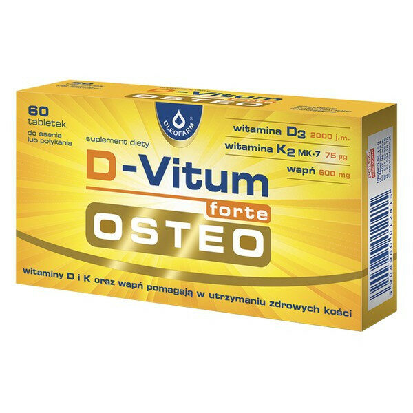 D-Vitum forte OSTEO - suplement diety, przeznaczony dla osób dorosłych w celu uzupełnienia diety w wapń oraz witaminę D3 i K2.POJEMNOŚĆ: 60 tabl.ZASTOSOWANIE:-Wapń jest potrzebny do utrzymania zdrowych kości.-Wapń i witamina D wspomagają zmniejszyć utratę minerałów kostnych u kobiet w okresie pomenopauzalnym. Niska gęstość mineralna kości stanowi czynnik ryzyka w odniesieniu do osteoporotycznych złamań kości.-Witamina D pomaga w utrzymaniu zdrowych kości i wspiera prawidłowe wchłanianie wapnia.-Witamina K wspomaga w utrzymaniu zdrowych kości, wpływając na proces wbudowywania wapnia do struktur tkanki kostnej.ZALECANA PORCJA DO SPOŻYCIA:Dorośli: 2 tabletki dziennie.Tabletkę należy ssać do całkowitego rozpuszczenia lub połknąć, popijając wodą.Składniki2 tabletki% RWS*wapń600 mg75%witamina K2 MK775 µg100%witamina D350 µg (2000 j.m.)1000%*% RWS - Referencyjnej Wartości Spożycia.SKŁAD:Węglan wapnia z muszli ostryg, substancja wiążąca: sorbitole, maltodekstryna, substancja przeciwzbrylająca: sole magnezowe kwasów tłuszczowych, menachinon, cholekalcyferol, aromaty, substancja przeciwzbrylająca: dwutlenek krzemu, substancja słodząca: sukraloza.WAŻNE INFORMACJE:W przypadku przyjmowania leków przeciwzakrzepowych należy przed zastosowaniem preparatu skonsultować się z lekarzem.-Nie należy przekraczać zalecanej dziennej porcji.-Dla utrzymania prawidłowego stanu zdrowia należy stosować zróżnicowaną dietę i prowadzić zdrowy tryb życia.-Suplement diety nie może być stosowany jak substytut (zamiennik) zróżnicowanej diety.-Przechowywać w temperaturze pokojowej.-Chronić od światła i wilgoci.-Przechowywać w sposób niedostępny dla małych dzieci.Nie stosować w przypadku nadwrażliwości/alergii na którykolwiek ze składników preparatuPrzed użyciem zapoznaj się z treścią ulotki dołączonej do opakowania bądź skonsultuj się z lekarzem lub farmaceutą, gdyż każdy preparat niewłaściwie stosowany zagraża Twojemu życiu lub zdrowiu