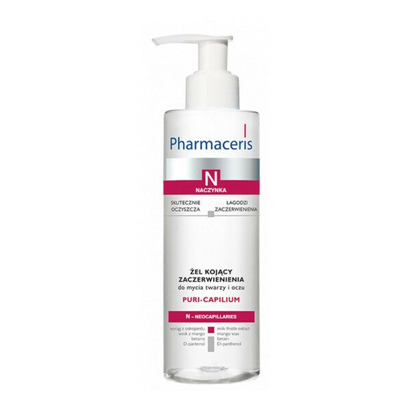 Żel kojący zaczerwienienia, do mycia twarzy i oczu Puri-Capilium - przeznaczony do codziennego oczyszczania skóry z rozszerzonymi naczynkami, zaczerwienieniem i nasilającym się rumieniem. Nie zawiera mydła.POJEMNOŚĆ: 190mlZASTOSOWANIE:Dokładnie oczyszcza i usuwa zanieczyszczenia oraz makijaż z twarzy i oczu, nie wysuszając skóry.Nie zawiera mydła.Formuła produktu opiera się na łagodnej bazie myjącej, która sprzyja zachowaniu naturalnej bariery ochronnej naskórka.Łagodzi skórę oraz zmniejsza występujące zaczerwienienie.Zawartość wosku z mango działa nawilżająco i odżywczo, zapobiega nadmiernemu napięciu naskórka oraz niweluje uczucie suchości.Alantoina i d-pantenol zmniejszają skłonność do występowania podrażnień.Żel wykazuje wysoki stopień tolerancji oraz odświeża skórę.Wosk z mango - zapewnia optymalny poziom nawilżenia, chroni i odbudowuje naskórek.D-pantenol - zmniejsza tendencję skóry do nadwrażliwości, łagodzi podrażnienia oraz przynosi ukojenie.Wyciąg z ostropestu - bogaty w sylimarynę, posiada właściwości przeciwzapalne i antyrodnikowe. Zabezpiecza skórę przed szkodliwym działaniem promieniowania słonecznego oraz przyspiesza proces regeneracji uszkodzonego naskórka.Alantoina - łagodzi podrażnienia i regeneruje skórę.SPOSÓB UŻYCIA:Niewielką ilość żelu Puri-Capilium, Pharmaceris N zaaplikować na dłoń i okrężnymi ruchami umyć twarz.Następnie spłukać wodą.Po osuszeniu skóry zastosować tonik i odpowiedni krem z serii Pharmaceris N.Stosować codziennie do każdorazowego mycia twarzy.SKŁAD:Aqua (Water), Glycerin, Cocamidopropyl Betaine, Panthenol, Betaine, Disodium Ricinoleamido MEA-Sulfosuccinate, PEG-40 Hydrogenated Castor Oil, Hydroxyethylcellulose, Disodium EDTA, PEG-70 Mango Glycerides, Ethylhexylglycerin, Propylene Glycol, Silybum Marianum (Lady's Thistle) Extract, Phenoxyethanol, Parfum (Fragrance).