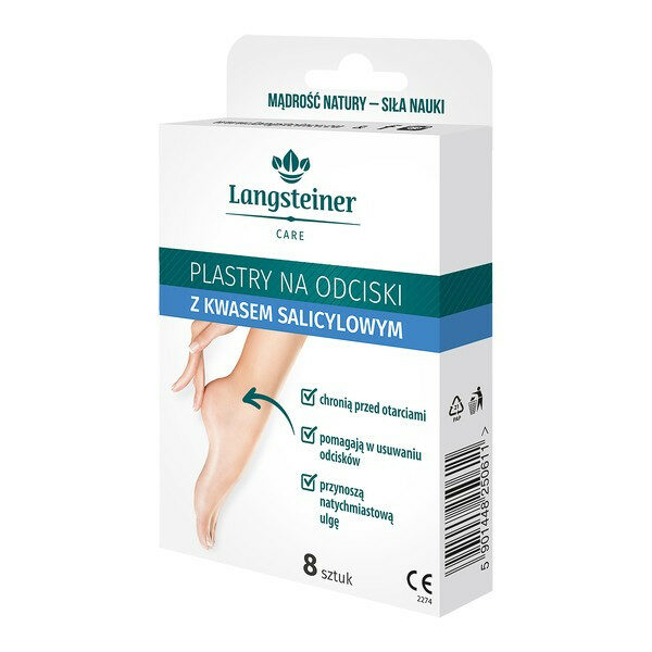 Plastry na odciski z kwasem salicylowymWyrób medyczny.Stosowane do łagodnego usuwania odcisków i zabezpieczania ich przed dodatkowymi urazami.Plaster zawiera 19,25 mg kwasu salicylowego oraz 0,671 mg kwasu mlekowego.Posiadają pierścień, który redukuje ucisk i chroni przed otarciem.Plastry samoprzylepne, o długość 65 mm.POJEMNOŚĆ: 8 sztukDZIAŁANIE:Plastry na odciski z kwasem salicylowym redukują ucisk na bolące miejsce, chronią przed otarciami oraz pomagają skutecznie i bezpiecznie usuwać odciski i modzele.WSKAZANIA:Plastry z kwasem salicylowym na bolesne i zrogowaciałe odciski. Mogą być stosowane na usuwanie odcisków.DAWKOWANIE:Jak stosować Plastry na odciski z kwasem salicylowym firmy Langsteiner? Na czystą i suchą stopę nałożyć plaster tak, aby substancja czynna przylegała do odcisku. Stosować plastry do momentu aż odcisk zostanie usunięty, maksymalnie 10-14 dni. Każdy plaster należy nałożyć na ok. 24 godziny. Po zakończeniu kuracji można usunąć środkową część odcisku stosując ciepłą kąpiel stóp z użyciem soli i mydła. Jeżeli w trakcie zabiegów skóra stanie się wrażliwa i pojawi się zaczerwienienie, poczekać z nałożeniem kolejnych plastrów.SKŁAD:W składzie plastrów znajdziemy: kwas salicylowy, kwas mlekowy, lanolina, wosk pszczeli żółty, żywica świerkowa, kopolimer etylenu i octanu winylu, kłącze kosaćca, kompleks miedziowy chlorofilu, terpentyna, balsam (olejek) kopaiwa, klej poliakrylatowy - durotak, kalafonia uwodorniona, włóknina, papier.OSTRZEŻENIA: Nie nakładać plastra na okolice odcisku, jeżeli skóra jest podrażniona lub występują stany zapalne. Nie stosować w przypadku uczulenia na kwas salicylowy i inne składniki produktu. Unikać stosowania w ciąży i w trakcie karmienia piersią. Nie stosować u niemowląt, dzieci, na chorą skórę (np. stany zapalne, rany, wypryski), u pacjentów z zaburzeniami czynności nerek (niewydolność nerek), u pacjentów chorych na cukrzycę oraz pacjentów ze słabym krążeniem krwi i stanami zapalnymi naczyń krwionośnych. Kwas salicylowy może zwiększać przepuszczalność skory dla innych leków stosowanych lokalnie.Przed użyciem zapoznaj się z treścią ulotki dołączonej do opakowania bądź skonsultuj się z lekarzem lub farmaceutą, gdyż każdy preparat niewłaściwie stosowany zagraża Twojemu życiu lub zdrowiu.