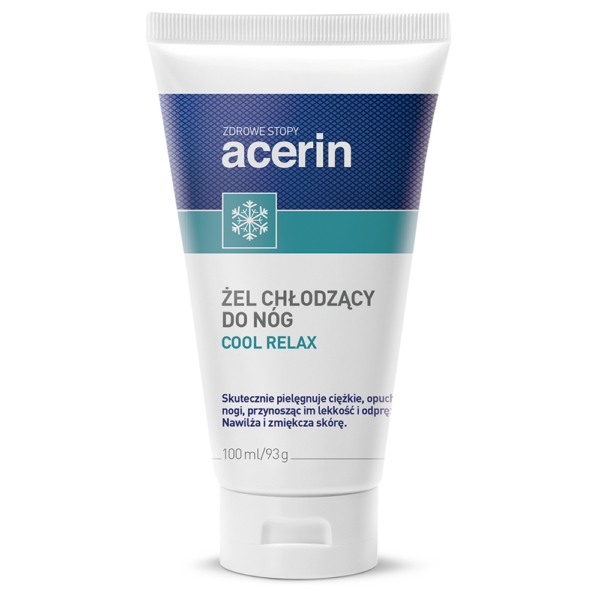 Chłodzący żel na opuchnięte i zmęczone nogi.POJEMNOŚĆ: 150mlZASTOSOWANIE:Zalecany do stosowania w przypadku:zmęczonych, ciężkich, obrzmiałych dłoni, stóp i nóg,dla osób wykonujących stojącą i siedząco pracę,w podróży,podczas urlopów,dla osób mających skłonność do rozszerzonych i pękających naczynek.Chłodzący żel na opuchnięte i zmęczone nogi, Acerin Cool Relax, zmniejsza uczucie zmęczenia, napięcia i ciężkości nóg.Aktywne składniki zawarte w żelu zmniejszają obrzmienia, przynosząc stopom i nogom ulgę i odprężenie.Mentol chłodzi i odświeża stopy i nogi.SPOSÓB UŻYCIA:Żel Acerin Cool Relax należy wmasować w zmęczone i opuchnięte części ciała kilka razy dziennie.SKŁAD:Aqua, Alcohol Denat., Glycerin, Menthol, Aesculus Hippocastanum Extract, Arnica Montana Extract, Carbomer, Triethanolamine, Glucosyl Hesparidin, Phenoxyethanol, DMDM Hydantoin, Linalool, Limonene, CI 42090.