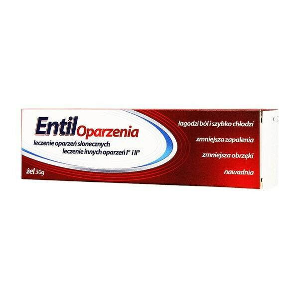 Entil Oparzenia, żel na oparzenia, 30 mlWyrób medycznyLeczenie i łagodzenie oparzeń słonecznych oraz oparzeń I i II stopniażel,POJEMNOŚĆ: 30 mlDZIAŁANIE:Wyrób medyczny Entil Oparzenia:łagodzi miejscowe objawy zapalne skóry powstałe w wyniku skaleczeń otarć i zadrapań.łagodzi ból (szybko chłodzi tkanki skóry, łagodzi i ogranicza rozprzestrzenianie się rany),zmniejsza zapalenie skórne,pomaga uniknąć infekcji,ponownie nawadnia,zmniejsza obrzęki.WSKAZANIA:Entil Oparzenia jest hydrożelem opartym na bazie fizycznej aktywności osmotycznej, przeznaczonym do leczenia i łagodzenia oparzeń powierzchownych I i II stopnia (ból, zaczerwieniania i pojawianie się pęcherzy na ograniczonej powierzchni), oparzenia domowe, oparzenia słoneczne. Łagodzi miejscowe objawy zapalne skóry powstałe w wyniku skaleczeń, otarć, zadrapań.DAWKOWANIE:Stosować na skórę. Nanieść Entil Oparzenia na całą oparzoną powierzchnię, lekko wmasowując. Pozostawić do wchłonięcia. Powtarzać 2 do 3 razy dziennie.SKŁAD:Glikol oktylenowy, glikol polietylenowy, glicerol, karbomer, wodorotlenek sodu, woda oczyszczona.OSTRZEŻENIA: Nie stosować preparatu w przypadku stwierdzenia nadwrażliwości na którykolwiek ze składników produktu.Tylko do użytku zewnętrznegoPodczas nanoszenia wyrobu może towarzyszyć uczucie ściągania.Unikać kontaktu z oczami.Nie stosować na otwarte rany.Nie stosować wyrobu w połączeniu z innymi produktami o podobnym zastosowaniu.Przechowywać w sposób niedostępny dla dzieci.Przechowywać w temperaturze od 15 do 25 ºC.Nie stosować wyrobu po upływie daty ważności.Należy zwrócić uwagę na zachowanie odpowiednich warunków przechowywania wyrobu.Chonić od światła i wilgoci.Po otwarciu opakowania okres ważności nie ulega zmianie , pod warunkiem, że po każdorazowym użyciu wyrobu opakowanie jest ponownie szczelnie zamykane.Przed użyciem zapoznaj się z treścią ulotki dołączonej do opakowania bądź skonsultuj się z lekarzem lub farmaceutą, gdyż każdy preparat niewłaściwie stosowany zagraża Twojemu życiu lub zdrowiu.