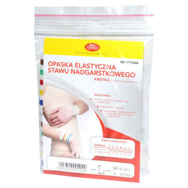 PANI TERESA ® Opaska elastyczna stawu nadgarstkowego - krótkaRozmiar L:obwód ręki w nadgarstku 23 - 25 cm.POJEMNOŚĆ: 1 sztWSKAZANIA:* wzmacnia aparat więzadłowy nadgarstka* łagodzi ból i obrzęki* zapobiega nadwerężeniom i nadciągnięciom stawu nadgarstkaDAWKOWANIE:Dopasowanie rozmiaru:W celu prawidłowego dopasowania rozmiaru należy dokonać pomiaru obwodu ręki w nadgarstku, a następnie wybrać rozmiar z tabeli na opakowaniu.Sposób zakładania:W opakowaniu znajdują się dwie opaski.Opaski zapiąć na wysokości stawów nadgarstkowych. Nie stosować bezpośrednio na rany lub uszkodzoną skórę.OSTRZEŻENIA: Stosowanie opaski należy skonsultować z lekarzem. W czasie noszenia opaski zalecane jest wykonywanie podstawowego zestawu ćwiczeń rehabilitacyjnych. Ciągle stosowanie opaski bez wykonywania ćwiczeń może doprowadzić do osłabienia mięśni.Przechowywać w oryginalnym opakowaniu, w suchym i zacienionym miejscu.Prać ręcznie w temperaturze 40°C przy użyciu delikatnych środków piorących np. przeznaczonych do prania wełny. Nie dopuszczać do silnego zabrudzenia! Nie prasować! Nie chlorować!Przed użyciem zapoznaj się z treścią ulotki dołączonej do opakowania bądź skonsultuj się z lekarzem lub farmaceutą, gdyż każdy preparat niewłaściwie stosowany zagraża Twojemu życiu lub zdrowiu.