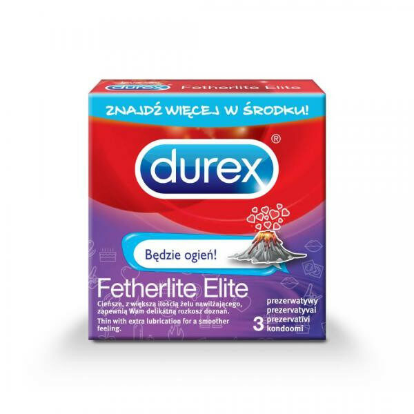 Durex Fetherlite Elite to jedne z naszych najlepszych prezerwatyw, stworzone by wzmacniać doznania i zbliżyć partnerów podczas seksu.Cieńsze niż standardowe prezerwatywy (55 mikronów)Z większą ilością żelu nawilżającego, która zapewni Wam delikatną rozkosz doznaniaPOJEMNOŚĆ: 3 sztDZIAŁANIE:Niezwykle cienkie prezerwatywy Durex Fetherlite Elite z dodatkowym środkiem nawilżającym umożliwiają zwiększenie wrażliwości i wzmocnienie odczuwanej przyjemności.Dzięki specjalnej technologii wytwarzania prezerwatywy Durex Fetherlite Elite mają przyjemniejszy zapach. Nic nie przeszkadza, więc możesz się zrelaksować i cieszyć przyjemnością.DAWKOWANIE:Używaj prezerwatywy tylko raz.OSTRZEŻENIA: Użycie żeli intymnych z serii Durex Play wraz z prezerwatywami może potęgować przyjemne doznania. Wszystkie żele z serii Durex Play mogą być bezpiecznie stosowane z prezerwatywami Durex, w przeciwieństwie do lubrykantów na bazie substancji oleistych, które mogą uszkodzić prezerwatywę.Testowane dermatologicznie.ISO 4074:2002W 100% testowane elektronicznie.Żadna metoda antykoncepcji nie zapewnia 100% ochrony przed ciążą, HIV i innymi chorobami przenoszonymi drogą płciową.Przechowywać w miejscu suchym, temperaturze pokojowej, z dala od promieni słonecznych.Przed użyciem zapoznaj się z treścią ulotki dołączonej do opakowania bądź skonsultuj się z lekarzem lub farmaceutą, gdyż każdy preparat niewłaściwie stosowany zagraża Twojemu życiu lub zdrowiu.