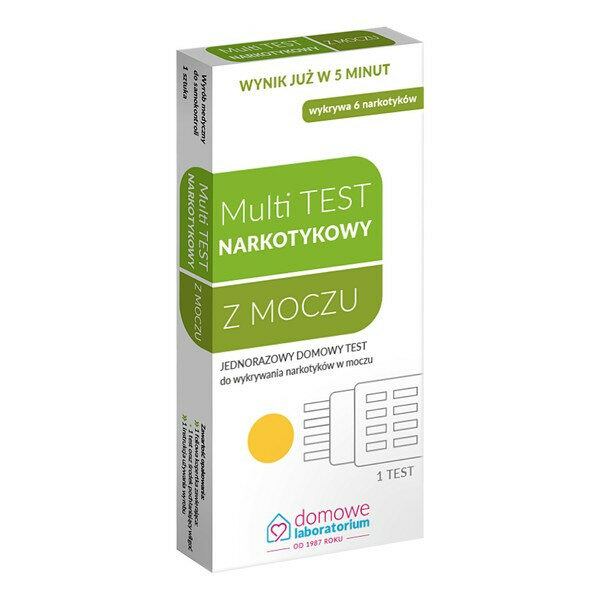 MultiTEST Narkotykowy z moczuwyrób medyczny do samokontrolijednorazowy domowy test zanurzeniowy do jednoczesnego wykrywania w moczu amfetaminy, kokainy, morfiny, heroiny, marihuany i haszyszutest wieloparametrowy, składa się z 4 pasków testowych umieszczonych w jednej plastikowej obudowie, każdy pasek odpowiada za wykrycie innego narkotyku w moczuPOJEMNOŚĆ: 1 sztDZIAŁANIE:MultiTEST narkotykowy z moczu składa się z 4 pasków testowych umieszczonych w jednej plastikowej obudowie. Każdy z tych pasków jest niezależnie działającym testem, w który narkotyk lub jego metabolit zawarty w badanym moczu wchodzi w odpowiednie reakcje immunologiczne z substancjami aktywnymi (barwny koniugat narkotyku lub jego metabolitu i koniugat przeciwciała skierowanego przeciwko narkotykowi lub jego metabolitowi ze złotem koloidalnym), które zostały naniesione na membranę w procesie produkcji testu.W przypadku, gdy dany narkotyk lub jego metabolit jest obecny w badanym moczu, na pasku testowym pojawia się tylko jeden barwny prążek. W przypadku, gdy dany narkotyk lub jego metabolit nie występuje w badanym moczu, na pasku testowym pojawiają się dwa barwne prążki.DAWKOWANIE:Przed wykonaniem badania:Oznaczenie powinno być wykonane z próbki świeżego moczu zebranego do czystego i suchego pojemnika.Mocz może być pobrany o dowolnej porze dnia.Jeśli jednak badania nie można wykonać tuż po pobraniu moczu, wówczas badany mocz można przechować do 48 godzin w chłodziarce (temperatura 2 - 8°C). Przed wykonaniem badania pojemnik z moczem wystawić z chłodziarki i pozostawić na pół godziny w temperaturze pokojowej.Jeśli test był przechowywany w temperaturze 2 - 8°C, to na pół godziny przed wykonaniem badania należy wyjąć go z chłodziarki i doprowadzić jego temperaturę do temperatury pokojowej.Podczas zanurzania testu w moczu należy zwrócić uwagę, aby: nie dotykać moczu plastikową obudową - testu nie wolno zanurzać w moczu za głęboko, tzn. nie wolnozanurzać powyżej dolnej krawędzi plastikowej obudowy, test był zanurzony w moczu na tyle długo (zwykle wystarcza 15 sekund), aby pojawiły się prążki kontrolne w okienkach wynikowych, badany mocz nie dostał się bezpośrednio do okienek wynikowych testu.Wykonanie badania:Tuż przed wykonaniem badania otworzyć foliową kopertkę przez jej rozdarcie. Wyjąć test chwytając za jego górną część. Zwrócić uwagę, aby nie dotykać palcami okienek wynikowych testu. W kopertce znajduje się również środek pochłaniający wilgoć, który należy wyrzucić do domowych śmieci.Zdjąć plastikową osłonę z panelu pasków testowych. Zanurzyć w badanym moczu wystające z obudowy paski testowe tak, aby nie dotknąć powierzchni moczu dolną krawędzią plastikowej obudowy testu.Panel pasków testowych należy zanurzyć w moczu i trzymać w nim ok. 15 sekund, do momentu pojawienia się prążków kontrolnych C w okienkach wynikowych dla poszczególnych pasków testowych.Gdy pojawią się prążki kontrolne, wyjąć panel testowy z moczu i umieścić test na poziomej powierzchni.Wynik odczytywać niezależnie dla każdego narkotyku po 5 minutach od momentu zanurzenia panela pasków testowych w moczu.Nie brać pod uwagę wyników otrzymanych po czasie dłuższym niż 8 minut.Po upływie 8 minut intensywność barwy prążków może ulec zmianie lub może pojawić się nowy prążek.Interpretacja wyników testu:Wynik dodatni: Pojawia się tylko jeden barwny prążek: w strefie kontrolnej C. Brak barwnego prążka w strefie testowej T. W badanym moczu stwierdza się obecność narkotyku lub jego metabolitu.Wynik ujemny: Pojawiają się dwa barwne prążki: w strefie testowej T i kontrolnej C. Intensywność barwy prążka testowego może być słabsza lub mocniejsza niż prążka kontrolnego. Jednak, jeśli pojawi się jakikolwiek ślad prążka testowego, to wynik testu należy interpretować jako ujemny. W badanym moczu nie stwierdza się obecności narkotyku lub jego metabolitu.Wynik nieważny: Pojawia się tylko prążek testowy T lub nie pojawia się żaden prążek. Badanie należy powtórzyć używając nowego testu.SKŁAD:Opakowanie MultiTEST narkotykowy z moczu zawiera wyposażenie niezbędne do wykonania jednego badania:1 foliową szczelnie zamkniętą kopertkę, w której znajduje się: 1 test i 1 środek pochłaniający wilgoć1 instrukcję używania wyrobuOSTRZEŻENIA: Test służy wyłącznie do użytku zewnętrznego. Opakowanie z testem należy przechowywać w temperaturze 2 - 30°C. Nie zamrażać.Nie używać testu po dacie ważności umieszczonej na opakowaniu.Nie używać testu w przypadku, gdy kopertka foliowa jest uszkodzona, ponieważ wilgoć z powietrza mogła uszkodzić test.Test jest przeznaczony tylko do jednokrotnego użycia.Zużyty test usuwać jak każdy inny odpad domowy.Test przechowywać w miejscu niedostępnym dla dzieci.Nie należy podejmować żadnych decyzji o charakterze medycznym bez uprzedniej konsultacji z lekarzem.Przed użyciem zapoznaj się z treścią ulotki dołączonej do opakowania bądź skonsultuj się z lekarzem lub farmaceutą, gdyż każdy preparat niewłaściwie stosowany zagraża Twojemu życiu lub zdrowiu.