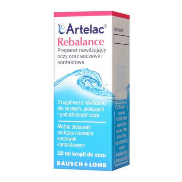 Artelac Rebalance, krople do oczu - Wyrób medyczny do nawilżania oczu i soczewek kontaktowych. Sterylny roztwór zawierający hialuronian sodu zapewnia długotrwałe nawilżenie dla suchych, piekących i podrażnionych oczu. Preparat zawiera kluczowe składniki występujące naturalnie w łzach, a także witaminę B12 która nadaje roztworowi charakterystyczny różowy kolor.POJEMNOŚĆ:10mlDZIAŁANIE:Działanie wyrobu medycznego Artelac Balance polega na łagodzeniu wywoływanych przez przewlekłe zaburzenia wydzielania łez objawów, takich jak: pieczenie, zmęczenie, zaczerwienienie i/lub zapalenie oraz bolesność oczu i uczucie piasku pod powiekami.Wspomaga uzupełnianie niedoboru naturalnych łez, natychmiast natłuszczając i nawilżając oczy oraz przynosząc im ulgę, jednocześnie dba o zdrowy stan powierzchni oczu, aby zapewniać im długotrwałą ulgę i ochronę.Artelac Rebalance zawiera unikalny składnik konserwujący, który w momencie kontaktu z powierzchnią oka szybko ulega przemianie w wodę i sól, czyli naturalne składniki łez.Jest hipotoniczny i przynosi oczom ukojenie, przywracając fizjologiczną równowagę osmotyczną filmu łzowego i powierzchni oka.Artelac Rebalance zawiera unikalny składnik konserwujący, który w momencie kontaktu z powierzchnią oka szybko ulega przemianie w wodę i sól, czyli naturalne składniki łez.WSKAZANIA:Artelac Rebalance jest wskazany do stosowania w przewlekłych zaburzeniach wydzielania łez oraz suchości oczu. Może być stosowany podczas stosowania soczewek kontaktowych.DAWKOWANIE:Przed zastosowaniem należy zapoznać się z ulotką dołączoną do opakowania.Zakraplać do worka spojówkowego.Nie należy dotykać końcówką buteleczki do oka, aby uniknąć zanieczyszczenia preparatu.SKŁAD:0,15% hialuronian sodu, PEG 8000, chlorek wapnia, chlorek magnezu, chlorek potasu, chlorek sodu, witamina B12, woda do wstrzykiwań, kwas borowy oraz Oxyd.WAŻNE INFORMACJE:Nie stosować w przypadku uczulenia na którykolwiek ze składników preparatu. Przechowywać w temperaturze 15-25 st. Celsjusza.Przed użyciem zapoznaj się z treścią ulotki dołączonej do opakowania bądź skonsultuj się z lekarzem lub farmaceutą, gdyż każdy preparat niewłaściwie stosowany zagraża Twojemu życiu lub zdrowiu.