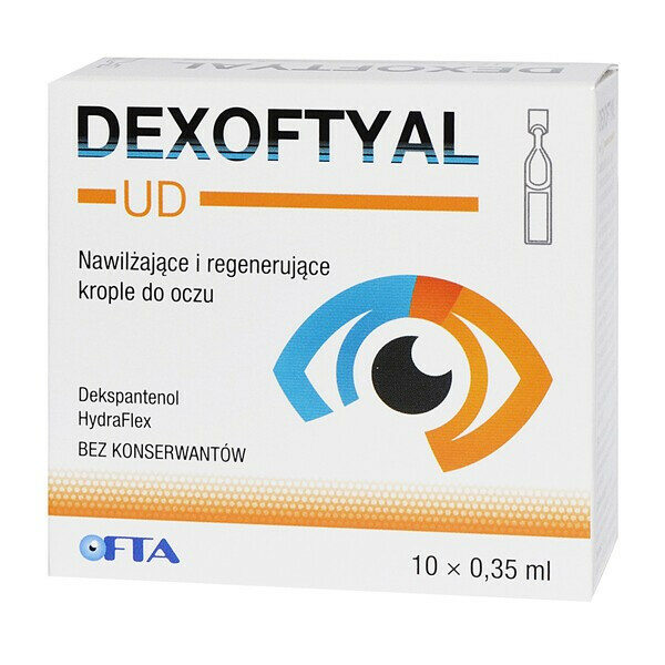 Dexoftyal UD, krople do oczuWyrób medycznyTo nawilżające i regenerujące krople do oczu z prowitaminą B5 w jednorazowych, sterylnych opakowaniach.Prowitamina B5 wspiera procesy regeneracyjne rogówki.Chroni oko przed uczuciem suchości oraz zmęczenia i podrażnienia oczu.POJEMNOŚĆ: 0,35 ml, 10 pojemników jednodawkowychDZIAŁANIE:Dexoftyal UDobecna w produkcie prowitamina B5 wspomaga procesy regeneracyjne rogówki.właściwości mukoadhezyjne HydraFlexu lepiej chronią powierzchnię oka.jest dobrze tolerowany i może być stosowany bez specjalnych ograniczeń.WSKAZANIA:Krople Dexoftyal UD są stosowane w celu nawilżenia i regeneracji oczu. Polecane w przypadku podrażnieniu i pieczenia oczu oraz uczucia zmęczenia wywołanego przez czynniki, takie jak: noszenie soczewek kontaktowych, długotrwałe patrzenie w ekran bądź długotrwałe prowadzenie pojazdów oraz klimatyzacja, wiatr, zanieczyszczenie powietrza, woda w basenie.DAWKOWANIE:Bezpośrednio do oczu (osoby noszące szkła kontaktowe nie muszą ich wyjmować):przyłożyć palec wskazujący do dolnej powieki oka i lekko ją pociągnąć w dółposługując się drugą ręką, zbliżyć końcówkę pojemnika do dolnej powieki oka; uważać, aby końcówka nie dotykała powierzchni okazakroplić 1 lub 2 krople do każdego oka i zamrugać 2 lub 3 razy, aby preparat został równomiernie rozprowadzony na powierzchni całego okaZa pośrednictwem soczewek kontaktowych:ułożyć soczewkę na środkowym palcu;nałożyć 1 lub 2 krople na soczewkę, a następnie włożyć soczewkę do oka;zamrugać okiem 2 lub 3 razy.SKŁAD:Dekspantenol 2%, Hydroksypropyloceluloza (Hydra Flex) 0,5%.OSTRZEŻENIA: Nie stosować w przypadku alergii nadwrażliwości na którykolwiek ze składników preparatu.Nie stosować po 2 miesiąca od pierwszego otwarcia.Jednodawkowe opakowania są przeznaczone do jednorazowego użytku.Przechowywać w miejscu niedostępnym dla dzieci.Chronić przed światłem.Przechowywać w temperaturze 4-25oC.Przed użyciem zapoznaj się z treścią ulotki dołączonej do opakowania bądź skonsultuj się z lekarzem lub farmaceutą, gdyż każdy preparat niewłaściwie stosowany zagraża Twojemu życiu lub zdrowiu.