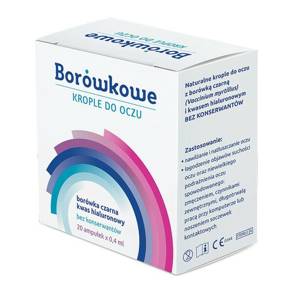 Borówkowe, krople do oczu, 0,4 ml, 20 minimsówWyroby medyczne.Naturalne krople do oczu z borówką czarną (Vaccinium myrtillus) i kwasem hialuronowym.Łagodzą objawy podrażnienia i suchości oczu, nawilżają i natłuszczają.Mogą być stosowane przez osoby noszące soczewki kontaktowe.Bez konserwantów.POJEMNOŚĆ: 20 minimsówDZIAŁANIE:Borówkowe krople do oczu nawilżają i natłuszczają oczy, łagodzą objawy suchości i podrażnienia oczu.WSKAZANIA:Wyrób medyczny stosowany jest przy suchości i niewielkim podrażnieniu oczu spowodowanym zmęczeniem, czynnikami zewnętrznymi, długotrwałą pracą przy komputerze lub noszeniem soczewek kontaktowych. Krople mogą być stosowane przez osoby noszące soczewki kontaktowe.DAWKOWANIE:Przed użyciem należy umyć i osuszyć ręce.W celu zapewnienia sterylności produktu, sprawdzić czy opakowanie jest zamknięte.Otworzyć ampułkę odkręcając górną część.Wpuścić po 2 krople do każdego oka.Nie dotykać oka końcówką ampułki.SKŁAD:Roztwór izotoniczny z borówką czarną, kwas hialuronowy, HPMC 0,25%.OSTRZEŻENIA: Produkt nie jest przeznaczony do nawilżania i pielęgnacji soczewek kontaktowych.W przypadku pogorszenia stanu oka należy skontaktować się z lekarzem specjalistą.Nie używać, jeśli opakowanie jest uszkodzone.Nie używać ponownie.Przechowywać w temperaturze pokojowej.Przechowywać w miejscu niedostępnym dla dzieci.Nie stosować produktu po upływie daty ważności.Przed użyciem zapoznaj się z treścią ulotki dołączonej do opakowania bądź skonsultuj się z lekarzem lub farmaceutą, gdyż każdy preparat niewłaściwie stosowany zagraża Twojemu życiu lub zdrowiu.
