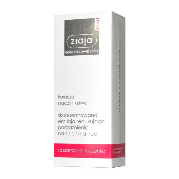 Skoncentrowana emulsja redukująca podrażnienia na dzień/na noc - przeznaczona do pielęgnacji skóry naczyniowej. Zmniejsza przepuszczalność naczyń krwionośnych oraz łagodzi zaczerwienioną skórę.POJEMNOŚĆ: 30 mlZASTOSOWANIE:Skoncentrowana emulsja redukująca podrażnienia na dzień/na noc, Ziaja MedBogata emulsja regenerująca na bazie ekologicznych składników.Uszczelnia naczynia krwionośne oraz zapobiega ich osłabieniu.Wzmacnia naturalną barierę naskórka.Zapobiega rozszerzaniu oraz powstawaniu nowych teleangiektazji.Dogłębnie nawilża oraz zmiękcza naskórek.Ogranicza przepuszczalność naczyń krwionośnych.Przynosi ukojenie zaczerwienionej skórze.Posiada właściwości rozjaśniające.Niweluje uszkodzenia włókien kolagenowych, dzięki czemu opóźnia proces starzenia się skóry.Składniki aktywne:Trokserutyna - zmniejsza przepuszczalność naczyń krwionośnych oraz usprawnia mikrokrażenie. Neutralizuje wolne rodniki oraz ma właściwości przeciwzapalne i przeciwobrzękowe.Escyna - uszczelnia naczynia krwionośne oraz redukuje stany zapalne. Działa przeciwobrzękowo oraz hamuje działanie hialuronidazy - enzymu, który odpowiedzialny jest za rozkład kwasu hialuronowego.Witamina C - wspomaga syntezę kolagenu dzięki czemu opóźnia procesy starzenia się skóry. Niweluje niewielkie zmarszczki oraz poprawia koloryt skóry. Dodatkowo wzmacnia naczynia krwionośne i stymuluje lepsze ukrwienie.D-panthenol - działa nawilżająco, uelastyczniająco i zmiękczająco. Łagodzi podrażnienia naskórka.SPOSÓB UŻYCIA:Skoncentrowaną emulsję redukującą podrażnienia, Ziaja Med nanieść miejscowo na zmiany naczyniowe.Następnie delikatnie wklepać.W przypadku skóry płytko unaczynionej stosować na noc na skórę twarzy, szyi i dekoltu.SKŁAD:Aqua, Caprylic/Capric Triglyceride, Elaeis Guineensis Oil, Octyldodecanol, Glycerin, Cetearyl Glucoside, Cetearyl Alcohol, Glyceryl Stearate Citrate, Hydrogenated Coco Glycerides, Troxerutin, Escin, Propylene Glycol, Dimethicone, Glyceryl Stearate, Sodium Acrylate/Sodium Acryloyldimethyl Tourate Copolymer, Isohexadecane, Polysorbate 80, Panthenol, Tocopheryl Acetate, PEG-8, Tocopherol, Ascorbyl Palmitate, Ascorbic Acid, Citric Acid, Sodium Polyacrylate, Phenoxyethanol, Methylparaben, Propylparaben, 2-Bromo-2-Nitropropane-1, 3-Diol, Diazolidinyl Urea.