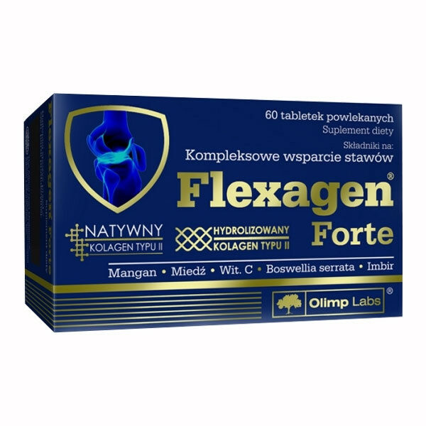 Flexagen Forte to suplement diety, w postaci tabletek powlekanych. Zawarty w preparacie ekstrakt z Boswellia serrata działa wspomagająco w utrzymaniu elastyczności i komfortu stawów, a imbir przyczynia się do zachowania ruchliwości stawów. Mangan uczestniczy w procesach tworzenia tkanek łącznych, a miedź w postaci chelatów aminokwasowych Albion pomaga w utrzymaniu prawidłowego stanu tkanek łącznych. Witamina C wpływa na prawidłowy przebieg procesu syntezy kolagenu, w celu zapewnienia właściwego funkcjonowania chrząstki i kości. Ponadto witamina C, miedź i mangan uczestniczą w ochronie komórek przed stresem oksydacyjnym. Kolagen typ II w formie natywnej i zhydrolizowanej stanowi główny składnik chrząstki stawowej.POJEMNOŚĆ: 60 tabletek ZASTOSOWANIE:Suplementacja diety w składniki preparatu.ZALECANE SPOŻYCIE:2 tabletki dziennie, popijając dużą ilością wody.SKŁAD:Hydrolizat kolegenu (w tym: kolagen typ II, siarczan chondroityny), substancja wypełniająca – celuloza mikrokrystaliczna; siarczan glukozaminy 2KCl (ze skorupiaków), ekstrakt Boswellia serrata, kwas L-askorbinowy – witamina C, ekstrakt imbiru (Zingiber officinale L.), składniki glazurujące – hydroksypropylometyloceluloza, glikol polietylenowy; substancje przeciwzbrylające - stearynian magnezu, dwutlenek krzemu; hialuronian sodu, diglicynian manganu (chelat aminokwasowy manganu Albion®), natywna forma kolagenu typ II, diglicynian miedzi (chelat aminokwasowy miedzi Albion).2 tabletki zawierają: 900mg hydrolizat kolagenu, kolagen typ II 450mg, siarczan chondroityny 90mg, natywny kolagen typ II 3mg, 200mg siarczan glukozaminy 2KCl, w tym: siarczan glukozaminy 150mg, ekstrakt Boswellia serrata (60% kwasu boswelinowego) 100mg, witamina C 80mg (100%)*, ekstrakt imbiru (5% gingeroli) 50mg, kwas hialuronowy 15mg, mangan 2mg (100%)*, miedź 1mg (100%)*.*RWS - Referencyjna Wartość Spożycia.WAŻNE INFORMACJE:Nie należy przekraczać zalecanej dziennej porcji. Zrównoważony sposób żywienia i prawidłowy tryb życia jest ważny dla funkcjonowania organizmu człowieka. Suplement diety nie może być stosowany jako substytut (zamiennik) zróżnicowanej diety. Suplement diety powinien być przechowywany w sposób niedostępny dla małych dzieci. Przechowywać w temperaturze pokojowej (15-25 stopni Celsjusza), w suchym miejscu. Zawiera składnik pochodzący ze skrupiaków.