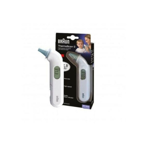 OPIS PRODUKTU:Stworzony dla dzieci i niemowląt termometr douszny Braun IRT3030Szybki i dokładny.Precyzyjny pomiar w zaledwie 1 sekundę.Mierzy ciepło podczerwone wytwarzane przez błonę bębenkową i otaczające tkanki, o potwierdzonej klinicznie dokładności.Poprawiona czystość końcówki czujnika, jeśli przypadkowo została użyta bez osłony sondy (nowość).Nowy wskaźnik gorączki audio.WŁAŚCIWOŚCI:Łatwa interpretacja wartości temperatury poprzez liczbę sygnałów dźwiękowych:- temperatura normalna (1 sygnał),- temperatura podniesiona (2 sygnały)- temperatura wysoka (4 sygnały)Funkcje dla łatwej i przyjemnej użytecznościKompaktowa konstrukcja jest łatwa do trzymaniaŁatwy do odczytania wyświetlacz LCDSonda odpowiednia dla noworodkówPamięć przywołuje ostatni odczyt temperaturyAutomatyczne wyłączanie po 60 sekundach dla dłuższej żywotności baterii.Odczyty w stopniach Celsjusza (34 - 42,2 ° C) lub Fahrenheita (93,2 - 108 ° F) Jednorazowe kapturki gwarantują higieniczny pomiarBez BPA i lateksu,Bez potrzeby czyszczenia i dezynfekowania termometruUżywając czystego jednorazowego kapturka z każdym pomiarem:- zapewniasz higieniczne użytkowanie- chronisz przed zanieczyszczeniem krzyżowym- zapewniasz że pozostałości woskowiny nie wpływają na dokładność pomiaru temperaturyAKCESORIA:Pokrywa ochronna główki/sondy termometru21 wymiennych jednorazowych kapturków ochronnych1 x bateria