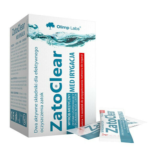 ZatoClear Med IrygacjaWyrób medyczny do irygacji nosa i zatok.Produkt do sporządzania roztworu chlorku sodu (soli) i ksylitolu. Dzięki aplikacji za pomocą specjalnej butelki (która nie wchodzi w skład zestawu uzupełniającego, można ją nabyć z zestawem startowym ZatoClear Med Irygacja), roztwór delikatnie i dokładnie przemywa jamę nosową i zatoki. Dodatek ksylitolu sprawia, że roztwór ma dodatkowo właściwości nawilżające błonę śluzową nosa. Płukanie roztworem ZatoClear Med pozwala wymyć z jamy nosowej zanieczyszczenia, alergeny i zalegającą wydzielinęPOJEMNOŚĆ: 15 saszetekDZIAŁANIE:Wyrób medyczny ZatoClear Med. Irygacja jest pomocny w szczególnie w przypadku ostrych i przewlekłych stanów zapalnych zatok przynosowych, alergicznego lub infekcyjnego nieżytu nosa, przed i po zabiegach chirurgicznych nosa i zatok, w okresie zwiększonej ekspozycji na pyły zawieszone w powietrzu (smog) lub miejscu pracy, a także w celu utrzymania prawidłowej higieny nosa i zatok przynosowych.DAWKOWANIE:Irygację należy wykonać za pomocą specjalnej butelki dołączonej do zestawu startowego ZatoClear Med Irygacja.Przed pierwszym użyciem opłucz wszystkie elementy butelki ciepłą wodą. Umyj i osusz ręce.Wsyp do butelki zawartość jednej saszetki ZatoClear Med. Irygacja i uzupełnij przegotowaną wodą (o temperaturze ciała) do poziomu zaznaczonej linii.Dokładnie zakręć butelkę, zakryj palcem otwór w nakrętce i kilkakrotnie wstrząśnij butelką do całkowitego rozpuszczenia substancji.Stań nad umywalką w lekko pochylonej pozycji. Przyłóż końcówkę butelki do jednego z otworów nosowych.Płynnym ruchem ściśnij butelkę tak, by roztwór dostał się do jamy nosowej. Przez cały czas irygacji spokojnie oddychaj przez usta. Roztwór wypłynie drugim otworem nosowym.Powtórz czynność dla pozostałej części roztworu, przykładając butelkę do drugiego otworu nosowego.Po zakończeniu irygacji delikatnie wydmuchaj nos.Pozostałą, niewykorzystaną część roztworu wylej. Wszystkie elementy butelki opłucz i osusz przed odłożeniem do przechowywania.Płukanie należy przeprowadzić 1-2 razy dziennie lub wg zaleceń lekarza. Jedna saszetka ZatoClear Med Irygacja w połączeniu z ok. 240 ml wody tworzy gotowy roztwór do płukania nosa i zatok.Nie należy wykonywać płukania nieprzegotowaną wodą z kranu oraz gorącą lub zimną wodą. Zalecane jest przygotowanie świeżego roztworu każdorazowo bezpośrednio przed wykonaniem irygacji. Nie stosować do iniekcji. Nie należy połykać roztworu. Z butelki do irygacji nie powinna korzystać więcej niż jedna osoba, ponieważ może się to przyczyniać do rozprzestrzeniania infekcji. Ze względów higienicznych zaleca się wymianę butelki po 2-3 miesiącach używania. Irygacje można przeprowadzać najpóźniej godzinę przed snem lub przed wyjściem na zewnątrz (przy temperaturze poniżej 19°C).SKŁAD:Ksylitol, chlorek sodu Ph.Eur.OSTRZEŻENIA:Wyrób może być bezpiecznie stosowany podczas ciąży oraz w trakcie karmienia piersią.Przed użyciem zapoznaj się z treścią ulotki dołączonej do opakowania bądź skonsultuj się z lekarzem lub farmaceutą, gdyż każdy preparat niewłaściwie stosowany zagraża Twojemu życiu lub zdrowiu.