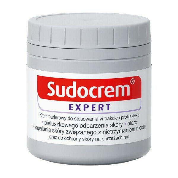 Sudocrem Expert, krem barierowy, 125 gWyrób medyczny.Dla dorosłych i dzieci od 1. dnia życia.Do stosowania przy pieluszkowym odparzeniu skóry, otarciach, zapaleniu skóry związanym z nietrzymaniem moczu oraz do ochrony skóry na obrzeżach ran.Łagodzi podrażnienia, zmniejsza dyskomfort i redukuje zaczerwienienie już po pierwszym dniu stosowania.POJEMNOŚĆ: 125gDZIAŁANIE:Sudocrem Expert, dzięki zawartości tlenku cynku, działa przeciwbakteryjnie, przeciwzapalnie i łagodząco na skórę.WSKAZANIA:Sudocrem Expert stosowany jest w celu zapobiegania i leczenia pieluszkowego odparzenia skóry, otarć, zapalenia skóry związanego z nietrzymaniem moczu oraz do ochrony skóry na obrzeżach ran.DAWKOWANIE:Umyć ręce zarówno przed, jak i po zastosowaniu kremu.Na oczyszczoną skórę nanieść cienką warstwę kremu barierowego.Wmasować krem małymi, kolistymi ruchami do czasu, gdy na skórze pozostanie cienka, przezroczysta warstwa.Pozostawić do wchłonięcia.Preparat może być stosowany tak często, jak to konieczne.Nie wkładać resztek kremu z powrotem do pojemnika.Po użyciu pojemnik należy zamknąć.Nakładać tylko cienką warstwę. Nałożenie większej ilości preparatu nie zwiększy jego skuteczności.SKŁAD:Składnik leczniczy: tlenek cynku.Pozostałe składniki: woda oczyszczona, parafina płynna, woski parafinowe, lanolina, seskwioleinian sorbitanu, wosk mikrokrystaliczny, benzoesan benzylu, wosk pszczeli syntetyczny, benzoesan sodu, alkohol benzylowy, octan linalilu, glikol propylenowy, cynamonian benzylu, zapach lawendowy, butylowany hydroksyanizol, kwas cytrynowy.OSTRZEŻENIA: Nie stosować w przypadku uczulenia na którykolwiek ze składników wyrobu.Nie dopuszczać do kontaktu z oczami i błonami śluzowymi.Tylko do użytku zewnętrznego.Stosować tylko zgodnie z zaleceniami.W przypadku braku poprawy lub pogorszenia stanu skóry należy skonsultować się z lekarzem.Przechowywać w miejscu niedostępnym i niewidocznym dla dzieci.Zabrudzony opatrunek, odzież lub pościel łatwo ulega zapłonowi podczas kontaktu z otwartym ogniem. Należy trzymać się z dala od źródeł ognia podczas stosowania tego produktu.Zużyć w ciągu 12 miesięcy od pierwszego otwarcia opakowania.Przed użyciem zapoznaj się z treścią ulotki dołączonej do opakowania bądź skonsultuj się z lekarzem lub farmaceutą, gdyż każdy preparat niewłaściwie stosowany zagraża Twojemu życiu lub zdrowiu.