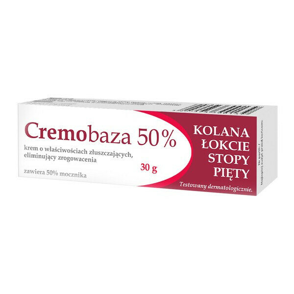 Cremobaza 50%.Krem o właściwościach złuszczających, eliminujący zrogowacenia.POJEMNOŚĆ: 30gZASTOSOWANIE:Cremobaza 50%, krem posiada w swoim składzie mocznik o stężeniu 50%, który działa złuszczająco.Zmiękcza zrogowacenia naskórka.Produkt ułatwia usuwanie stwardniałego martwego naskórka, dając efekt gładkiej i miękkiej skóry.Krem sprawdzi się do stosowania w takie miejsca jak, zrogowaciała skóra: łokci, kolan, stóp, szczególnie popękanych pięt.Produkt wspomaga walkę w w przypadku: modzeli, odcisków i nagniotków.SPOSÓB UŻYCIA:Cremobaza 50%, krem posiada w swoim składzie mocznik o stężeniu 50%, który działa złuszczająco.Zmiękcza zrogowacenia naskórka.Produkt ułatwia usuwanie stwardniałego martwego naskórka, dając efekt gładkiej i miękkiej skóry.Krem sprawdzi się do stosowania w takie miejsca jak, zrogowaciała skóra: łokci, kolan, stóp, szczególnie popękanych pięt.Produkt wspomaga walkę w w przypadku: modzeli, odcisków i nagniotków.SKŁAD:Aqua, Hydroxyethyl Urea, Propylene Glycol, Isopropyl Myristate, Paraffinum Liquidum, Cetearyl Alcohol, Glyceryl Stearate Citrate, Ammonium Lactate, Disodium Phosphate, Citric Acid, Glyceryl Caprylate.