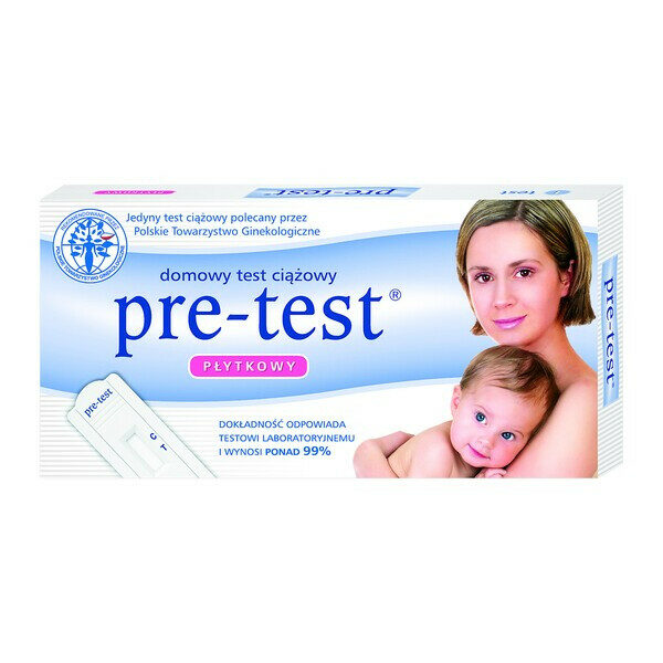 Pre-Test, test ciążowy, płytkowy.Test ciążowy polecany przez Polskie Towarzystwo Ginekologiczne.POJEMNOŚĆ: 1 sztukaDZIAŁANIE:Wiarygodny - wiarygodność odpowiada testowi laboratoryjnemu i wynosi ponad 99%Wczesny - może być użyty o dowolnej porze dnia począwszy od 1-ego dnia spodziewanej miesiączkiWysoka czułość - wykrywa hCG przy stężeniu 25 mlU/MlCzytelny - jedna linia: BRAK CIĄŻY Dwie linie: CIĄŻAŁatwy w użyciu - wystarczy pobrać próbkę moczu do załączonego pojemniczka i wkroplić do płytki testowej.Szybki - wynik testu w ciągu 1-5 min.