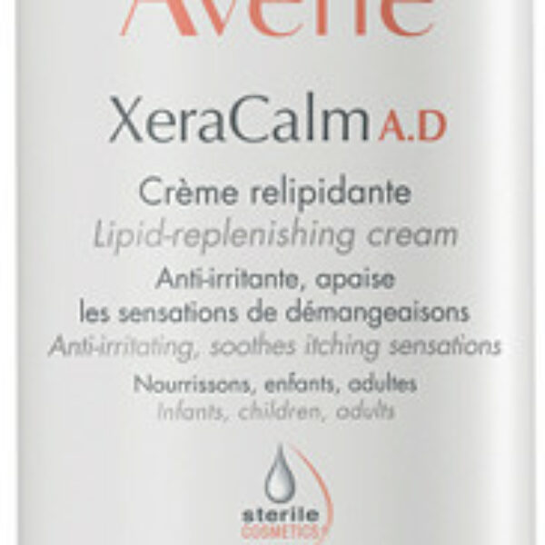 Avene XeraCalm A.D Krem uzupełniający lipidy 400 mlPOJEMNOŚĆ: 400mlZASTOSOWANIE:Formuła kremu uzupełniającego lipidy XeraCalm A.D została opracowana przy wykorzystaniu minimalnej liczby składników tak by ograniczyć ryzyko wystąpienia alergii. Zawiera kompleks l-modulia, który zmniejsza uczucie świądu wywołane suchością skóry oraz koi zaczerwienienia i podrażnienia spowodowane nadreaktywnością skóry. CER-OMEGA to lipidy wspierające regenerację, o działaniu odżywczym i wzmacniającym film ochronny. Dzięki temu zwiększają one naturalną odporność skóry na drażniące czynniki zewnętrzne. Z kolei woda termalna Avene posiada właściwości kojące i łagodzące podrażnienia. Skutecznie zmniejsza uczucie dyskomfortu i zmiękcza skórę. Krem nie zawiera żadnych substancji zapachowych, alkoholu ani barwników. Ostatecznie zapewnia skórze ukojenie, uczucie komfortu i sprawia, że jest miękka i elastyczna.SPOSÓB UŻYCIA:Nakładaj krem raz lub dwa razy dziennie na skórę twarzy i/lub ciała po jej uprzednim oczyszczeniu XeraCalm A.D olejkeim do kapieli uzupełniającym lipidySKŁAD:Avene Thermal Spring Water, Mineral Oil (Paraffinum Liquidum), Glycerin, cetearyl Alcohol, Oenothera Biennis Oil, Caprylic/Capric Triglyceride, Cetearyl Glucoside, Aquaphilus Dolomiae extract, Arginine, Carbomer, Evening primose Oil/Palm Oil Aminopropanediol Esters, Glycine, Sodium Hydroxide, Tocopherol