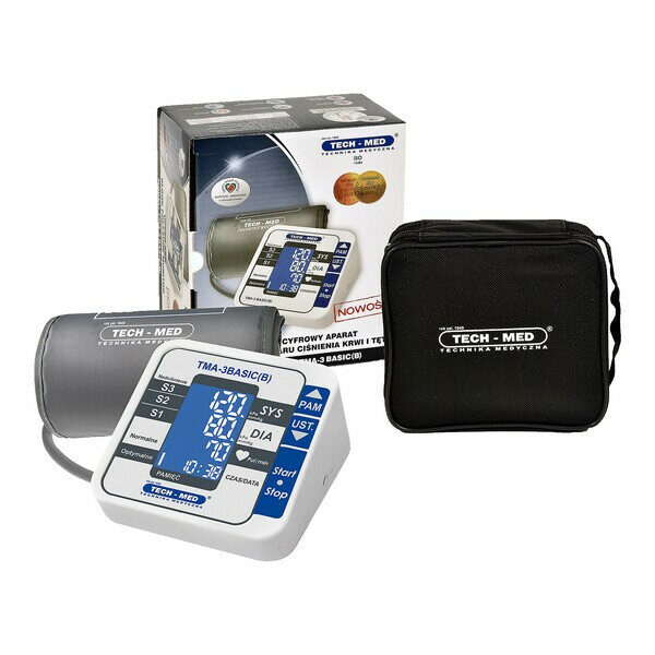 Ciśnieniomierz TMA-3BASIC(B) to wyrób medyczny przeznaczony do pomiarów ciśnienia tętniczego krwi w warunkach domowych, w podróży, a także w gabinecie lekarskim.POJEMNOŚĆ: 1 szt.DZIAŁANIE:Dzięki zastosowaniu technologii "MWI" produkt wykonuje pomiar ciśnienia krwi tętniczej z najwyższą dokładnością, która została potwierdzona w badaniach klinicznych. Jednocześnie ucisk ręki został ograniczony do minimum, co zwiększa komfort i wygodę pomiaru.WSKAZANIA:Ciśnieniomierz przeznaczony jest do wykonywania pomiarów ciśnienia tętniczego krwi u osób dorosłych, prowadzonych w warunkach domowych, w podróży, bądź w gabinecie lekarskim.SPOSÓB UŻYCIA:1. Załóż mankiet na lewe odsłonięte ramię, tak aby przewód biegł po jego wewnętrznej stronie (w jednej linii z małym palcem). Zaciśnij mankiet tak by można było wsunąć pod niego jeden palec, a jego dolny koniec powinien znajdować się około 2-3 cm nad zgięciem łokcia.2. Lewą rękę oprzyj swobodnie dłonią do góry na płaskiej powierzchni przed sobą, tak aby mankiet znajdował się na wysokości serca.3. Plecy oprzyj prosto o oparcie krzesła, stopy trzymaj płasko na podłodzie, nie krzyżuj nóg. Odpocznij około 5 minut.4. Włącz urządzenie za pomocą przycisku START/STOP. Rozpocznie się pompowanie mankietu, nie ruszaj się.5. Po zakończeniu pomiaru wynik pojawi się na wyświetlaczu.SKŁAD:W zestawie znajdują się: ciśnieniomierz naramienny TMA-3BASIC(B), mankiet o obwodzie 22-33 cm, 4 baterie AA, etui oraz instrukcja obsługi w języku polskim.OSTRZEŻENIA: Pomiędzy wykonywaniem pomiaru u następnej osoby odczekaj minimum 3 minuty, jeśli kolejny pomiar wykonany ma być u tego samego pacjenta należy odczekać minimum 15 minut.W celu usunięcia zanieczyszczeń przetrzyj urządzenie wilgotną szmatką.Przechowuj w miejscu niedostępnym dla dzieci, z dala od wilgoci i promieni słonecznych.Chroń ciśnieniomierz przed kontaktem z wodą potrząsaniem i upadkami.Przed użyciem zapoznaj się z treścią ulotki dołączonej do opakowania bądź skonsultuj się z lekarzem lub farmaceutą, gdyż każdy preparat niewłaściwie stosowany zagraża Twojemu życiu lub zdrowiu.