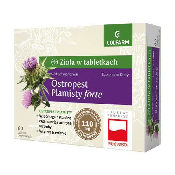 Ostropest plamisty forte - suplement diety zawierający w swoim składzie wyciąg z ostropestu plamistego, który korzystnie wpływa na funkcjonowanie wątroby i dróg żółciowych. Produkt przeznaczony dla osób dorosłych.POJEMNOŚĆ: 60 szt.ZASTOSOWANIE:Ostropest plamisty wspiera produkcję żółci oraz naturalną regenerację komórek i tkanek wątroby. Dodatkowo ostropest plamisty wspomaga chronić komórki i tkanki wątroby przed uszkodzeniem oksydacyjnym oraz czynnikami zewnętrznymi, wspomaga trawienie i utrzymanie fizjologicznych funkcji oczyszczania wątroby, wpływa na zdrowie serca oraz przyczynia się do utrzymania prawidłowego poziomu cukru we krwi.ZALECANA PORCJA DO SPOŻYCIA:Dorośli: 1 tabletka dziennie.SKŁAD:Substancja wypełniająca: celuloza; wyciąg z ostropestu plamistego; substancja wypełniająca: sól sodowa karboksymetylocelulozy usieciowana; substancje przeciwzbrylające: sole magnezowe kwasów tłuszczowych, dwutlenek krzemu; substancje glazurujące: sorbitole, kwasy tłuszczowe, guma arabska, karagen.WAŻNE INFORMACJE:Nie przekraczać zalecanej porcji dziennej. Suplement diety nie może być stosowany jako substytut zróżnicowanej diety. Nie stosować w przypadku uczulenia na którykolwiek ze składników preparatu. Nie zaleca się stosowania preparatu u kobiet w ciąży i karmiących piersią. Dla zachowania prawidłowego stanu zdrowia duże znaczenie ma zbilansowana i zróżnicowania dieta oraz zdrowy tryb życia.Przechowywanie: w zamkniętym opakowaniu, w suchym miejscu, w temperaturze 15-25 st. Celsjusza, w sposób niedostępny dla małych dzieci. Chronić przed światłem.Nie stosować w przypadku nadwrażliwości/alergii na którykolwiek ze składników preparatuPrzed użyciem zapoznaj się z treścią ulotki dołączonej do opakowania bądź skonsultuj się z lekarzem lub farmaceutą, gdyż każdy preparat niewłaściwie stosowany zagraża Twojemu życiu lub zdrowiu.