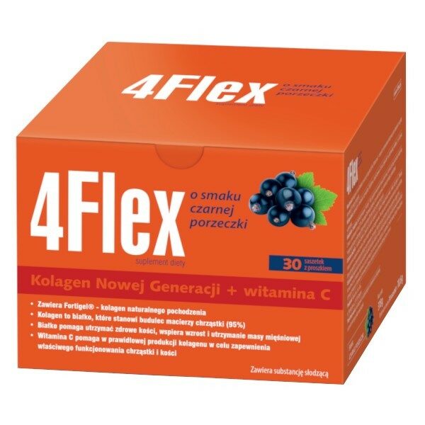 4Flex, smak czarnej porzeczkiPOJEMNOŚĆ: 30 saszetekZASTOSOWANIE:Witamina C, poprzez bezpośredni wpływ na komórki chrzęstne (chondrocyty), wspiera właściwą syntezę kolagenu w celu zapewnienia prawidłowego funkcjonowania chrząstki i kości.Podczas stosowania widoczne są dodatkowe właściwości kolagenu (białka) zawartego w preparacie 4Flex: wpływ na wzrost i utrzymanie masy mięśniowej oraz zachowanie zdrowych kości.Preparat jest doskonale przyswajalny. Zawarte w nim bioaktywne peptydy kolagenowe są wchłaniane w formie aktywnej. Szybko docierają do tkanki chrzęstnej, gdzie są absorbowane.czyste proteinybez cholesterolubez glutenubez tłuszczuZALECANA PORCJA DO SPOŻYCIA:1 saszetka dziennie, rozpuścić w 100 ml wody, mleka lub jogurtu. Zaleca się regularne stosowanie przez dłuższy czas (minimum 3 miesiące)SKŁAD:Składniki w 1 saszetce: hydrolizat kolagenu 10 g, regulator kwasowości (kwas cytrynowy), aromat czarnej porzeczki, witamina C (kwas L-askorbinowy) 60 mg (75% Zalecanego Dziennego Spożycia), barwnik (koszenila), substancja słodząca (sukraloza).WAŻNE INFORMACJE:Nie przekraczać zalecanej porcji dziennej. Suplement diety nie może być stosowany jako substytut zróżnicowanej diety. Nie stosować w przypadku uczulenia na którykolwiek ze składników preparatu. Nie zaleca się stosowania preparatu u kobiet w ciąży i karmiących piersią. Dla zachowania prawidłowego stanu zdrowia duże znaczenie ma zbilansowana i zróżnicowania dieta oraz zdrowy tryb życia.Przechowywanie: w zamkniętym opakowaniu, w suchym miejscu, w temperaturze 15-25 st. Celsjusza, w sposób niedostępny dla małych dzieci. Chronić przed światłem.Nie stosować w przypadku nadwrażliwości/alergii na którykolwiek ze składników preparatuPrzed użyciem zapoznaj się z treścią ulotki dołączonej do opakowania bądź skonsultuj się z lekarzem lub farmaceutą, gdyż każdy preparat niewłaściwie stosowany zagraża Twojemu życiu lub zdrowiu.