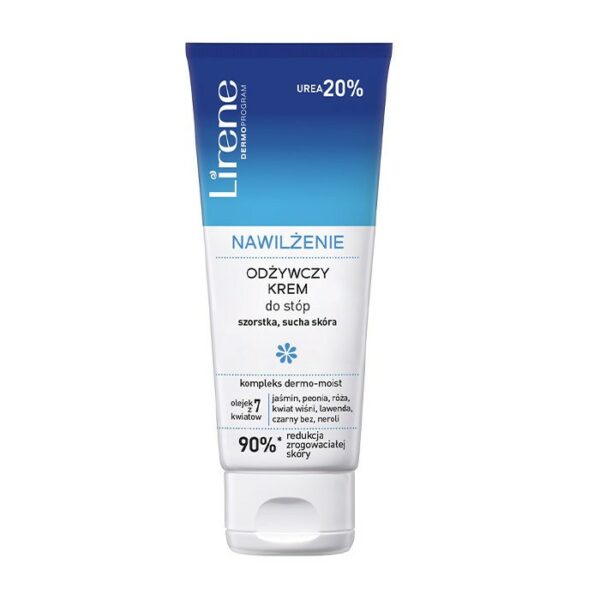 Lirene Dermoprogram Nawilżenie Odżywczy Krem Do Stóp Urea 20% 100MLLirene Nawilżenie odżywczy krem do stóp odżywia i chroni przed przesuszaniem. Formuła zawiera 20% mocznik, który przyspiesza złuszczanie naskórka i odpowiada za regenerację głębszych warstw skóry. Kompleks dermo-moist to precyzyjnie dobrane składniki aktywne o działaniu nawilżającym, które pomagają walczyć z istniejącymi zgrubieniami i zapobiegają powstawaniu nowych. Kompozycja olejków z 7 kwiatów to bogactwo składników odżywczych. Przy systematycznym stosowaniu skóra odzyskuje właściwy poziom nawodnienia, staje się miękka i gładka w dotyku.zawartość mocznika 20%zawiera olejki z 7 kwiatówkompleks dermo-moistredukuje zrogowaciałą skóręintensywnie odżywia skóręStosowanie: Nanieś krem na umytą i osuszoną skórę stóp, szczególnie pięt. Wmasuj do wchłonięcia.