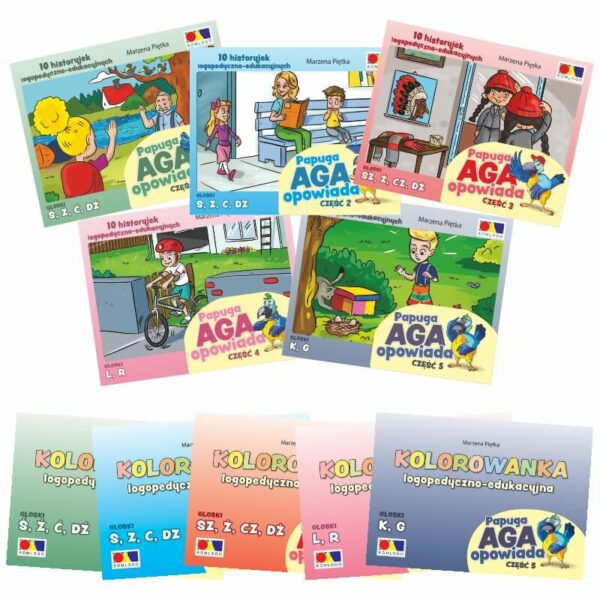 Papuga Aga Opowiada. Historyjki obrazkowe + kolorowanki logopedyczno-edukacyjne. Części 1-5 [PAKIET]