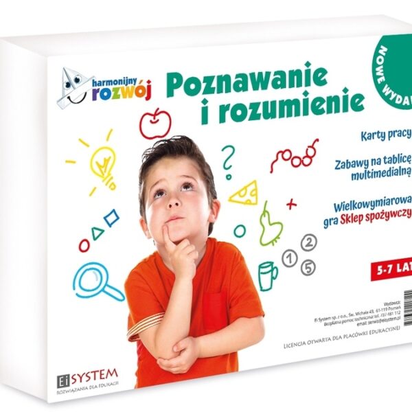 Harmonijny Rozwój – wprowadź dzieci w multimedialny świat zabawy i naukiHarmonijny rozwój to seria pomocy dydaktycznych dla:nauczycieli wychowania przedszkolnego,"zerówek" (zarówno przedszkolnych jak i szkolnych),oraz dla pierwszych i drugich klas edukacji wczesnoszkolnej.Nauka przez zabawę:znakomita zabawa dla uczniów,innowacyjna forma zabawy i nauki, łącząca multimedia z pomocami tradycyjnymi,skuteczne przygotowanie do nauki w szkole podstawowej,uzupełnienie każdego programu nauczania.Wszystkie elementy zestawu pozwalają na naturalne dla dzieci współdziałanie, eksperymentowanie, twórczą ekspresję i ruch, nie zaniedbują też ćwiczeń samokontroli oraz koncentracji.Atrakcyjne ćwiczenia zawarte w programie aktywizują dzieci i oswajają je z pracą zespołową, przygotowując jednocześnie do nauki.Zadania pomagają realizować cele wychowania przedszkolnego i szkolnego z podstawy programowej i mogą stanowić uzupełnienie wybranego przez nauczyciela programu nauczania.Program wykorzystuje metodę pracy zespołowej z wykorzystaniem funkcji wielodotyku /multi-touch/ tablicy interaktywnej. Dzięki tej funkcji rysowanie i korzystanie z zasobów na tablicy jest możliwe przez kilkoro dzieci jednocześnie, a każde z nich może wykonywać inne ćwiczenia.Każdy pakiet zawiera:3 interaktywne gry specjalnie przystosowane do zespołowego wykorzystania na tablicy multimedialnejkarty pracy do wydrukowania lub kopiowania zawierające ćwiczenia do wykonania indywidualnego, zespołowego lub materiały do przygotowania przedstawień teatralnychgrę dydaktyczną wykonaną z kartonów o dużym formacie, przeznaczoną do wykorzystania przez całą klasę lub duże grupy dzieci.Licencja otwarta – nieograniczona ilość użytkowników i urządzeń!Kup taniej w zestawie: Harmonijny Rozwój ZESTAW 8 PAKIETÓW. Multimedialne gry i zabawy wspierające wszechstronny rozwój dzieci w wieku 5-7 latHarmonijny Rozwój. Poznawanie i rozumienie (Ei System)Pakiet zawiera:interaktywne gry przystosowane do zespołowego wykorzystania na tablicy multimedialnej,karty pracy do kopiowania zawierające ćwiczenia do pracy indywidualnej,grę edukacyjną wykonaną z kartonów o dużym formacie, przeznaczoną do gry na dywanie, do używania przez całą klasę lub grupy dzieci,poradnik metodyczny.Harmonijny Rozwój. Poznawanie i rozumienie ćwiczy i rozwija u dzieci:umiejętności klasyfikowaniaumiejętności rozpoznawania relacji przyczynowo-skutkowychumiejętności układania zdarzeń w kolejnościzdolność wnioskowaniaumiejętności językowespostrzegawczośćlogiczne myśleniekoncetrację uwagipercepcję wzrokową koordynację wzrokowo-ruchowąumiejętności społeczne, umiejętność współpracy w grupieGry interaktywneZabawa w sklep – zadaniem graczy jest umieszczenie poszczególnych produktów spożywczych (wędlin, nabiału, pieczywa i owoców oraz warzyw) na poszczególnych regałach. Gra pomaga w rozwijaniu umiejętności klasyfikowania. Ćwiczy percepcję wzrokową, koncentrację uwagi i współpracę w grupie.Opowiadania – gra polega na wspólnym układaniu elementów historii. Służy do rozwijania umiejętności rozpoznawania relacji przyczynowo-skutkowych, układania zdarzeń w kolejności i umiejętności językowych.Detektywi – zadaniem dzieci jest znalezienie na poszczególnych planszach niepasującego elementu. Gra rozwija zdolność wnioskowania.Karty pracyOwoc czy warzywo?Zwierzęta domowe i dzikieNa okrągłoOpowiadanie historii (dzieci młodsze)Opowiadanie historii (dzieci starsze)Opowiadanie historii (dzieci starsze)Zwierzęta domowe – labiryntZwierzęta dzikie – labiryntKolorowe koralikiSekwencje – karta kolorowaZnajdź różnice (dzieci młodsze)Znajdź różnice (dzieci starsze)Gra wielkoformatowaGra wielkoformatowa „Sklep spożywczy” pomaga w rozwijaniu umiejętności klasyfikowania. Na odpowiednich półkach dzieci mają umieścić kartoniki przedstawiające nabiał, mięso i wędliny, warzywa i owoce oraz pieczywo. Podczas gry uczą się współpracy w grupie.Z kolei kartonowe monety pozwalają na wykorzystanie gry w pierwszej klasie do ćwiczenia podstawowych działań matematycznych na przykładzie wyliczania należności, wydawania reszty oraz układania zadanych liczb z monet o różnych nominałach.Zabawa w sklep: