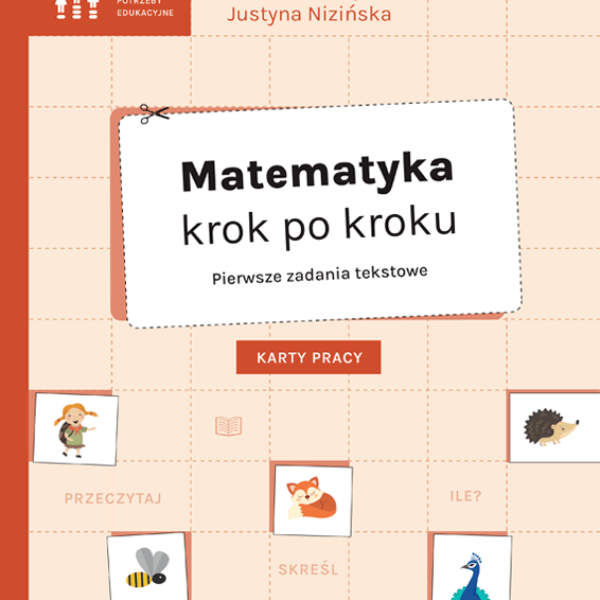 Matematyka krok po kroku. Pierwsze zadania tekstowe. Karty pracy mogą być wykorzystywane przez dzieci typowo się rozwijające, jak i dzieci ze specjalnymi potrzebami edukacyjnymi.Karty będą doskonałym materiałem uzupełniającym do pracy:w czasie wprowadzania nauki rozwiązywania zadań tekstowych w klasach 1-3 szkoły masowej,podczas zajęć rewalidacyjnych, wyrównawczych, wspomagających,podczas nauki matematyki w szkołach specjalnych.Cele publikacji:wspieranie treningu czytania,nauka czytania ze zrozumieniem,nauka rozwiązywania zadań tekstowych.Zeszyt zawiera 76 kart pracy z zakresu:dodawania w zakresie 1–10,odejmowania w zakresie 1–10,dodawania w zakresie 1–20,odejmowania w zakresie 1–20.