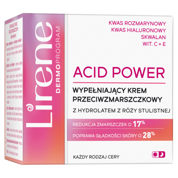 Lirene Dermoprogram Acid Power Wypełniający Krem Przeciwzmarszczkowy 50ML LIRENE ACID POWER to nowatorskie formuły zawierające unikalne połączenie specjalistycznych kwasów kosmetycznych oraz łagodzących hydrolatów. Odpowiednio dobrane pH minimalizuje ryzyko podrażnień i nieestetycznego łuszczenia się skóry, pozwalając na regularną, nieagresywną stymulację komórek do regeneracji. Dzięki temu struktura i koloryt skóry stopniowo wyrównują się, a twarz odzyskuje młodzieńczą świeżość i blask.KWASY AHA/PHA:REDUKUJĄ NIEDOSKONAŁOŚCI i PRZEBARWIENIA REGULUJĄ ODNOWĘ KOMÓRKOWĄ,SPŁYCAJĄC ZMARSZCZKIODBLOKOWUJĄ PORY i WYRÓWNUJĄ STRUKTURĘ SKÓRYNAWILŻAJĄWYPEŁNIAJĄCY KREM PRZECIWZMARSZCZKOWY:do każdego rodzaju ceryKwas rozmarynowy w sferycznych nośnikach – przeciwdziała uszkadzaniu DNA komórek skóry przez wolne rodniki. Utrzymuje prawidłową elastyczność i jędrność.Hydrolat z róży stulistnej – regeneruje, wygładza, opóźnia procesy starzenia i łagodzi podrażnienia.Wit. C w stabilnej formie o wysokiej aktywności biologicznej (Ascorbyl Tetraisopalmitate) – stymuluje syntezę kolagenu oraz spowalnia procesy rozpadu kolagenu, elastyny i kwasu hialuronowego, wypełniając zmarszczki od środka. Przyspiesza regenerację naskórka.Olej z kiełków pszenicy – nawilża, regeneruje oraz nadaje miękkości cerze. Dzięki zawartości nienasyconych kwasów tłuszczowych ujędrnia i opóźnia procesy starzenia.Skwalan – wzmacnia barierę ochronną, uzupełniając braki w lipidach naskórka. Nawilża i uelastycznia skórę.Wysokocząsteczkowy kwas hialuronowy – minimalizuje utratę wody z naskórka. Wygładza i koi.Wit. E – działa odmładzająco i ochronnie.EFEKTY WIDOCZNE GOŁYM OKIEM!wygładzenie skóry o 28%*poprawa nawilżenia skóry o 22%*redukcja głębokości, objętości i liczby zmarszczek o 17%*redukcja objętościrozszerzonych porów o 16%**Na podstawie badań aparaturowych z udziałem kobiet przed i po 3 tygodniach stosowania kremuSPOSÓB UŻYCIA: Rano i wieczorem wmasuj krem w skórę twarzy i szyi, omijając okolicę oczu. Możesz stosować samodzielnie lub na wybrane serum LIRENE ACID POWER. Podczas użytkowania zabezpieczaj skórę filtrem UV przed ekspozycją na słońce.ŚRODKI OSTROŻNOŚCI: Nie stosować na uszkodzoną skórę, w okresie ciąży oraz karmienia piersią. Bezpośrednio po aplikacji może występować delikatne pieczenie, które jest naturalną reakcją skóry na działanie kwasów. Jeśli pieczenie jest silne, nie ustępuje po 2-3 minutach od aplikacji lub skóra pozostaje zaczerwieniona/podrażniona, zaleca się spłukać preparat obficie wodą i zaprzestać stosowania.