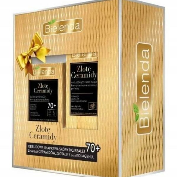 Bielenda Zestaw Złote Ceramidy 70+ Krem Do Twarzy 50ML + Krem Pod Oczy 15ML Damski zestaw prezentowy od Bielenda w skład którego wchodzą bestsellerowe produkty z serii Złote Ceramidy. W skład tego kozackiego zestawu wchodzą następujące kosmetyki:1. Bielenda Złote Ceramidy 70+ Przeciwzmarszczkowy Krem Do Twarzy Dzień/Noc 50ML - Linia kosmetyków Złote Ceramidy marki Bielenda przeznaczona jest do trudnej pielęgnacji i wymagającej cery dojrzałej. W jej składzie znajduje się innowacyjny multikompleks ceramidów 1, 3 oraz 6, który wnika w głąb skóry. Krem widocznie poprawia jakość skóry oraz poprawia jej kondycję. Optymalnie nawilża skórę, wygładza ją oraz dodaje blasku. Zapewnia doskonałą kondycję skóry zarówno dzień jak i w nocy.Składniki aktywne:multikompleks ceramidów 1, 3, 6 - biozgodny ze skórą, szybko i łatwo wnika w jej głąb i pomaga odbudować i naprawić jej strukturę. Dzięki uzupełnieniu skóry w naturalne ceramidy, powstaje nieprzepuszczalna bariera, która chroni naskórek przed utratą wody oraz destrukcyjnym wpływem czynników zewnętrznych, a skóra nabiera nowej jakości - ma lepszą strukturę i wygląd, staje się jędrna i gładka, elastyczna, optymalnie nawilżona, w pełni zrewitalizowana.24 karatowe złoto - pobudza komórki do produkcji kolagenu, ujędrnia, regeneruje, poprawia elastyczność i koloryt skóry, spowalnia proces jej wiotczenia.kolagen - silnie nawilża, wspomaga naprawę i regenerację skóry. Odpowiada za jędrność i sprężystość, spowalnia procesy wiotczenia naskórka, skutecznie wygładza zmarszczki. W sposób widoczny napina i modeluje owal twarzy.Cechy i właściwości kremu przeciwzmarszczkowego Bielenda Złote Ceramidy:poprawia jakość i kondycję cery dojrzałej,optymalnie nawilża,zmniejsza widoczność zmarszczek i przebarwień,do cery dojrzałej i wrażliwej2. Bielenda Złote Ceramidy Wygładzająco Nawilżający Krem Przeciwzmarszczkowy Pod Oczy 15ML - Linia kosmetyków Złote Ceramidy marki Bielenda przeznaczona jest do trudnej pielęgnacji i wymagającej cery dojrzałej. W jej składzie znajduje się innowacyjny multikompleks ceramidów 1, 3 oraz 6, który wnika w głąb skóry. Krem optymalnie nawilża i wzmacnia delikatną, cienką, dojrzałą skórę wokół oczu. Rozświetla, zmniejsza widoczność cieni pod oczami.Główne składniki aktywne:multikompleks ceramidów 1,3,6 - biozgodny ze skórą, szybko i łatwo wnika w jej głąb i pomaga odbudować i naprawić jej strukturę. Dzięki uzupełnieniu skóry w naturalne ceramidy, powstaje nieprzepuszczalna bariera, która chroni naskórek przed utratą wody oraz destrukcyjnym wpływem czynników zewnętrznych, a skóra nabiera nowej jakości - ma lepszą strukturę i wygląd, staje się jędrna i gładka, elastyczna, optymalnie nawilżona, w pełni zrewitalizowana.24 karatowe złoto - pobudza komórki do produkcji kolagenu, ujędrnia, regeneruje, poprawia elastyczność i koloryt skóry, spowalnia proces jej wiotczenia.kwas hialuronowy - jedna z najsilniejszych substancji nawilżających, mająca wpływ na poprawę jędrności i elastyczności naskórka.Cechy i właściwości kremu przeciwzmarszczkowego Bielenda Złote Ceramidy:optymalnie nawilża,wzmacnia delikatną, cienką, dojrzałą skórę,wygładza zmarszczki,zmniejsza widoczność zmarszczek