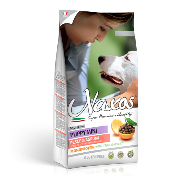 NAXOS PUPPY MINI RYBA I OWOCE CYTRUSOWE 150gPełnoporcjowa karma dla szczeniąt małych ras.Kraj produkcji: WłochySkład: odwodnione białko ryb (skrzelołusk 37%); sorgo; ryż; tłuszcz zwierzęcy; hydrolizowane białko ryb; pulpa cytrusowa, suszona (pomarańcza 2% cytryna 1%); siemię lniane; wysłodki buraczane suszone; strąki szarańczynu strąkowego; drożdże (źrodło MOS); drożdże piwne; oliwa z oliwek; sole kwasów tłuszczowych (EPA, DHA); glukozamina; fruktooligosacharydySkładniki analityczne: wilgotność 9,00%; białko surowe 30%; tłuszcz surowy 19,00%; włókno surowe 2,40%; popiół surowy 5,50%; wapń 1,30%; fosfor 1,00%; Omega 3 0,90%; Omega 6 3,50%; wartość energetyczna 4.080 Kcal/Kg.Dodatki (na kg):Dodatki dietetyczne: Witamina A 21.000 IU – Witamina C 70,00 mg – Witamina D3 1.400 IU – Witamina E 275 IU – Witamina B1 8,40 mg – Witamina B2 8,40 mg – Witamina B3 35,00 mg – Witamina B6/chlorowodorek pirydoksyny 7,00 mg – Biotyna 1,60 mg – Witamina K 1,75 mg – Witamina B12 0,16 mg – kwas foliowy 1,60 mg – Chlorek choliny 2.200,00 mg – Żelazo (Węglan żelaza(II)) 175,00 mg – Jod (bezwodny jodan wapnia) 1,90 mg– Miedź (Pentahydrat siarczanu miedzi(II)) 14,00 mg – Mangan (Tlenek manganu(II)) 56,00 mg – Cynk (tlenek cynku) 155,00 mg – Selen (selenit sodu) 0,14 mg – DL Metionina, czysta technicznie 3.500,00 mg. Dodatki sensoryczne: ekstrakt z kasztanowca. Przeciwutleniacze.Poradnik stosowania i zachowania: Produkt należy podawać raz na dobę, zgodnie z tabelą odżywczą umieszczoną na tyle opakowania, rozdzielając go na dwa/trzy główne posiłki pozostawiając psu w pobliżu miskę świeżo nalanej i czystej wody. W przypadku przejścia z jednego produktu na drugi zalecane jest stopniowe jego zastępowanie. W zależności od stanu psa, jego sposobu życia i warunków środowiskowych należy dokonać niewielkiej korekty wskazanej ilości produktu. Produkt należy przechowywać w świeżym i suchym miejscu.Najlepiej spożyć przed upływem terminu/partii produktu: termin ważności wraz z nr. partii produkcji odbity jest na tyle opakowania.