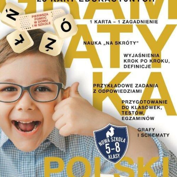 Karty edukacyjne Język polski. Gramatyka to pierwsza pomoc w domu i w szkole dla uczniów klas V-VIII szkoły podstawowej.Zestaw zawiera 28 kart edukacyjnych:1 karta – 1 zagadnienie,nauka „na skróty”,wyjaśnienia KROK PO KROKU, definicje,przykładowe zadania z odpowiedziami,grafy i schematy.Znakomite przygotowanie do powtórzeń, klasówek, testów i egzaminów!Język polski. Karty edukacyjneFormat kart został tak pomyślany, by mieściły się między kartkami w zeszycie. Mają one bowiem służyć uczniom do nauki począwszy od piatej klasy. Karty służą:do przygotowania do powtórzeń, klasówek i sprawdzianów w trakcie całego pięcioletniego cyklu nauki w szkole podstawowej,na koniec do egzaminu ósmoklasisty.Karty edukacyjne to znakomita pomoc, którą uczniowie mogą wykorzystywać samodzielnie, a także z udziałem dorosłych.