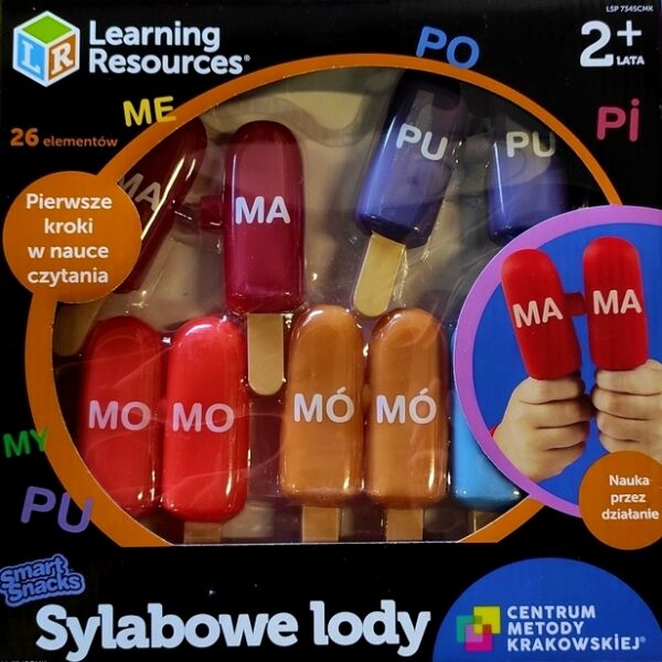 Sylabowe Lody, Centrum Metody KrakowskiejSylabowe lody Centrum Metody Krakowskiej to zestaw przeznaczony dla dzieci, które poznały samogłoski i rozpoczynają naukę sylab otwartych.Zawiera paradygmaty:PA PO PU (PÓ) PE PI PYMA MO MU (MÓ) ME MI MYoraz dodatkową parę sylab tworzącą wyraz LO-DY.Lody łączą się w pary, które oznaczone są tą samą sylabą. Zestaw inspiruje do wielu kreatywnych zabaw, dzięki którym nauka czytania będzie łatwa i przyjemna!Nauka sylab i czytaniaZestaw Sylabowe lody składa się z 26 kolorowych lodów, po 2 lody w 13 kolorach. Wypustka i dziurka na boku loda umożliwia łączenie dwóch elementów w pary.Produkt został przygotowany we współpracy z brytyjskim wydawnictwem Learning Resources.Zajrzyj do środka!