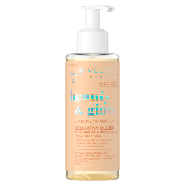 Eveline Beauty & Glow Delikatny Olejek Do Demakijażu Twarzy Kosmetyk bogaty jest w naturalnie pielęgnujące olejki z pestek winogron, ze słodkich migdałów i olejek abisyński. Odżywiają i łagodzą skórę oraz skutecznie usuwają makijaż. Witamina E działa antyoksydacyjnie i przeciwzmarszczkowo, a banan pomaga przywrócić skórze młodzieńczy blask i miękkość. Olejek nie narusza naturalnego pH skóry, delikatnie odświeża i sprawia, że Twoja skóra znów poczuje się doskonale!Doskonale oczyszczaUsuwa nawet wodoodporny makijażOdpowiedni dla wrażliwej skóry twarzy i oczuZawiera 96% składników pochodzenia naturalnego!Nie pozostawia tłustej warstwyOdświeża skóręUsuwa nadmiar sebumWygładza zmarszczki Odżywia naskórekNie wysuszaOdpowiedni dla weganStosowanie: Odrobinę olejku wetrzyj w suchą skórę twarzy i powiek. Spłucz ciepłą wodą. Bardzo wydajna formuła starczy na długo!Pojemność: 145ML