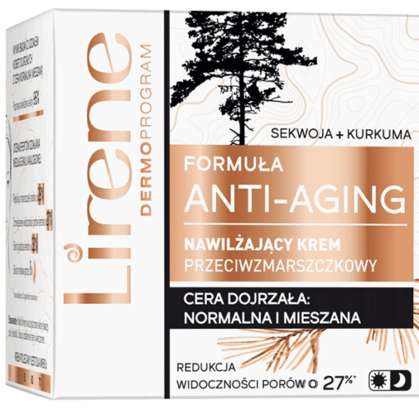 Lirene Anti-Aging Przeciwzmarszczkowy Krem Do Twarzy Dzień/Noc Sekwoja i Kurkuma 50ML Upływające lata wpływają negatywnie nie tylko na wygląd, lecz także na kondycję Twojej cery. Jeśli chcesz jak najdłużej zachować młode i atrakcyjne oblicze, zastosuj przeciwzmarszczkowy krem nawilżające Anti-aging Lirene.skuteczne działanie przeciwzmarszczkoweprawidłowy poziom nawilżeniaskóra matowa przez 8hSkładniki aktywne zawarte w kremie Lirene:1. SEKWOJA – pobudza funkcje i aktywność komórek skóry na dwóch poziomach:naskórek: wzmacnia metabolizm skóry, przyspiesza jej odnowę i regenerację, wyrównuje strukturę skóry oraz spłyca istniejące zmarszczki skóra właściwa: zwiększa produkcję białek podporowych, poprawia jędrność i elastyczności, redukuje skłonność do postawania nowych zmarszczek i linii2. KORZEŃ KURKUMY – opóźnia procesy starzenia zewnątrzpochodnego (spowodowanego stresem, ekspozycją na słońce, zmiennością temperatury czy też zanieczyszczeniem) oraz redukuje niedoskonałości3. KWIAT LOTOSU – normalizuje wydzielanie sebum, przywracając skórze mieszanej idealną równowagę i stopniowo redukując widoczność porów 4. OLEJ LNIANY – długotrwale i intensywnie nawilża, poprawia elastyczność i jędrność skóry.WYNIKI BADAŃ Z UDZIAŁEM KOBIET DOJARZAŁYCH Z CERĄ NORMALNĄ/MIESZANĄ:96% badanych potwierdza zauważalną poprawę nawilżenia skóryRedukcja zmarszczek średnio o 29%*Zmniejszenie widoczności porów średnio o 27%*Skóra gładsza średnio o 32%**ocena wg 5-stopniowej skali analogowej po 3 tygodniach stosowania98% składników pochodzenia naturalnego.Wyprodukowany przy użyciu energii odnawialnej.
