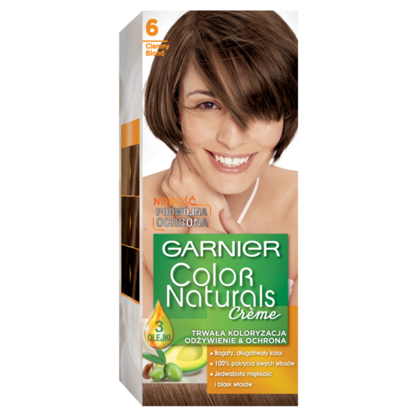 Garnier Color Naturals Creme Farba Do Włosów 6 Ciemny Blond Wygodny w użyciu krem koloryzujący, zapewniający długotrwałą koloryzację w połączeniu z odżywieniem i dbałością o kondycję włosów. Dobrze kryje nawet bardzo oporną siwiznę włosów. Formuła farby została unowocześniona, zawiera teraz o 20% więcej odżywki, która dzięki sile 3 olejków przywraca i utrzymuje jedwabistość i blask włosów. Kolor jest długotrwały i wyrazisty. Sama aplikacji farby jest prosta. Ma ona konsystencję lekkiego kremu, który nie spływa i łatwo się rozprowadza na włosach. Odżywka ma również przyjemny, owocowy zapach.Właściwości farby do włosów Garnier Color Naturals Creme:Dobrze kryjąca formułaZawiera odżywcze olejkiŁatwa aplikacjaKremowa konsystencjapodwójna ochronaodżywienie & ochrona3 olejkibogaty, długotrwały kolor100% pokrycia siwych włosówjedwabista miękkość i blask włosówZawartość opakowania:Flakon z mleczkiem utleniającym 60MLTubka z odżywczym kremem koloryzującym 40MLOdżywka z 3 olejkami 12MLinstrukcja / rękawiczkiPrzed użyciem zapoznaj się z instrukcją i ostrzeżeniami na opakowaniu. Jak każda farba, może powodować reakcje alergiczne.Sposób użycia:wlej mleczko utleniające i krem koloryzujący do niemetalowej miseczki i dokładnie wymieszajnałóż całość mieszanki za pomocą pędzelka. Przestrzegaj dokładnie czasu aplikacji i następnie spłucz.w celu zakończenia koloryzacji, nałóż na całą długość włosów pielęgnującą odżywkę. Pozostaw na kilka minut, a następnie spłucz.