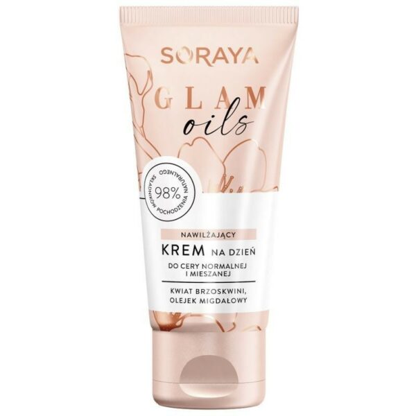SORAYA Glam Oils Nawilżający krem na dzień 50ml:krem o lekkiej, jedwabistej formule, która zapewni twojej skórze nawilżenie, cudowną gładkość i przyjemne poczucie komfortu, idealnie sprawdzi się do pielęgnacji cery normalnej i mieszanej, przy regularnym stosowaniu poprawia wygląd cery, podkreślając jej naturalne piękno, ekstrakt z kwiatów brzoskwini – jest bogaty we flawonoidy, ogranicza negatywny wpływ wolnych rodników na skórę, nawilża i wygładza cerę. Drzewo brzoskwiniowe w Chinach nazywane jest drzewem życia. W wielu kulturach „brzoskwiniowa cera” to cera zdrowa, aksamitnie gładka, o ładnym kolorycie.olejek migdałowy – przyjemnie wygładza i odżywia skórę.kwas hialuronowy – silnie nawilża i wygładza.Znajdziesz w nim aż 98% składników pochodzenia naturalnego.Kosmetyk wegański.