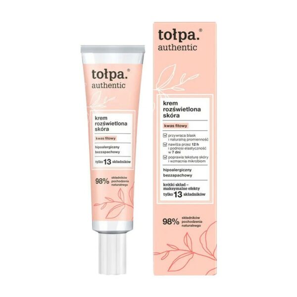 Tołpa Authentic Rozświetlający Krem Do Twarzy 40ML Tołpa Authentic to naturalna linia kosmetyków, które są w 100% wegańskie i zawierają ponad 95% składników pochodzenia naturalnego. Zostały specjalnie stworzone z myślą o codziennej pielęgnacji twarzy. W serii znajdują się kosmetyki o różnym działaniu dopasowane do różnych potrzeb skóry. Formuły produktów nie zawierają SLS-u, parabenów, silikonów, sztucznych barwników, oleju parafinowego, alkoholu etylowego czy mikroplastików. Krem do twarzy, dzięki zawartości w składzie czystych molekuł kwasu fitowego nawilża skórę, poprawia jej teksturę i wydobywa naturalny blask. Lekka formuła szybko się wchłania bez efektu błyszczenia i lepienia. Krem to prawdziwy ratunek dla szarej i zmęczonej skóry. Ponadto produkt wspiera mikrobiom, ponadto łagodzi podrażnienia, a przy tym nie zaburza naturalnego pH. Zawiera 13 prostych składników, takich jak woda oczyszczona, kwas fitowy czy torf tołpa. 98% składników pochodzenia naturalnego.skutecznie nawilża przywraca blask, rozświetlawzmacnia mikrobiomłagodzi podrażnieniapoprawia elastyczność98% składników pochodzenia naturalnegotylko 13 niezbędnych składnikówbezzapachowyPrzeznaczenie do skóry normalnej, do skóry odwodnionej, do skóry pozbawionej elastyczności, do skóry z oznakami starzeniaSposób użycia: Nanieś na oczyszczoną skórę i wmasuj kolistymi ruchami. Stosuj codziennie rano i/lub wieczorem.