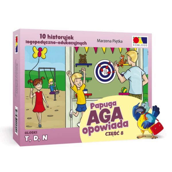 Papuga Aga opowiada cz. 8 - T, D, N to zestaw 10 historyjek obrazkowych 4-elementowych, które można wykorzystać w terapii logopedycznej i zabawach ogólnorozwojowych dzieci w wieku przedszkolnym i wczesnoszkolnym.W książeczce znajdują się krótkie opowiadania związane z historyjkami. Pogrubieniem zaznaczono w nich wyrazy z ćwiczonymi głoskami: t, d, n, ń/ni.Historyjki umożliwiają:ćwiczenie artykulacji,rozwijanie słownictwa biernego i czynnego,rozumienie dłuższych wypowiedzi,ćwiczenie opisywania i opowiadania,rozwijanie wyobraźni i myślenia, w tym myślenia przyczynowo-skutkowego.Zawartość pudełka:10 historyjek 4-elementowych (11 x 14 cm)książeczka (14 x 11 cm)