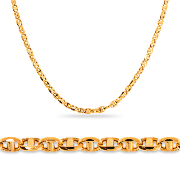 Długość obwodu łańcuszka: 50 cmRodzaj splotu: gucci / marinaSzerokość splotu łańcuszka: 3,1 mmPróba złota: 585Wypełnienie ogniw: dmuchane (puste w środku)ŁAŃCUSZEK 50 CM SPLOT GUCCI - PIĘKNA BIŻUTERIASplot gucci, znany także pod określeniem marina, to fantazyjne, owalne ogniwa, których środek przedzielony jest na dwie części, łączące się z kolejnymi ogniwami. Wersje masywniejsze najczęściej kupowane są przez Panów.ZŁOTY ŁAŃCUSZEK GUCCI O DŁUGOŚCI 50 CM - STWORZONY DLA MĘŻCZYZNŁańcuszek posiada dmuchane (puste w środku) ogniwa, co oznacza że jest lżejszy i wygodniejszy do noszenia. Dmuchane ogniwa oznaczają także znacznie niższą cenę (związaną z mniejszą wagą) w porównaniu do łańcuszka z pełnymi ogniwami.Grubszy (szerokość splotu 3,1 mm) złoty łańcuszek 50 cm ze splotem gucci będzie świetnie prezentował się na szyi. Poniżej prezentujemy przykładową męską wizualizację łańcuszka o tej długości. Pamiętaj, że rzeczywiste ułożenie łańcuszka będzie zależało od wzrostu i budowy ciała osoby, dl
