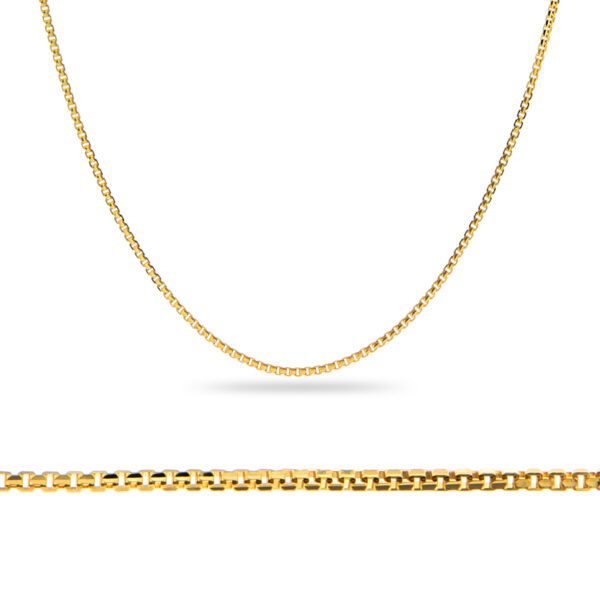 Długość obwodu łańcuszka: 50 cmRodzaj splotu: kostkaSzerokość splotu łańcuszka: 1,1 mmPróba złota: 585ŁAŃCUSZEK 50 CM SPLOT KOSTKA - IDEALNY DO ZAWIESZEKSplot kostka jest najbardziej klasycznym i bardzo popularnym - zarówno wśród Pań, jak i Panów - wzorem, z kwadratowymi ogniwami połączonymi poprzecznie, pod katem 90 stopni. Ogniwa są najczęściej drobne, a łańcuszek pięknie odbija światło i dobrze układa się na szyi. Łańcuszki ze splotem kostka są wprost idealne do noszenia z zawieszkami.ZŁOTY ŁAŃCUSZEK KOSTKA O DŁUGOŚCI 50 CMDelikatny (szerokość splotu 1,1 mm) złoty łańcuszek 50 cm ze splotem kostka będzie świetnie prezentował się na szyi. Poniżej prezentujemy przykładową kobiecą i męską wizualizację łańcuszka o tej długości. Pamiętaj, że rzeczywiste ułożenie łańcuszka będzie zależało od wzrostu i budowy ciała osoby, dla której łańcuszek jest przeznaczonyPrzykładowa kobieca wizualizacja złotego łańcuszka o długości 50 cmPrzykładowa męska wizualizacja złotego łańcuszka o długości 50 cm