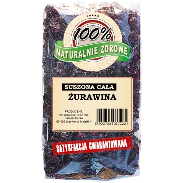 Żurawina jest jednym z najzdrowszych owoców jagodowych, jakie znajdziesz w sklepach, także jako suszone owoce. Roślina naturalnie rośnie na terenach podmokłych czy wręcz bagnistych. Powszechnie kojarzona jest z leczeniem infekcji dróg moczowych to liczba zalet jakie niesie ze sobą spożywanie żurawiny jest znacznie większa. Co więcej, żurawina wyróżnia się smakiem i niskokalorycznością, co sprawia, że doskonale sprawdza się jako słodka przekąska oraz dodatek do wielu potraw, zarówno słodkich jak i słonych.Jakie są korzyści płynące z jedzenia żurawiny? Te smaczne owoce najlepiej znane są ze swoich właściwości diuretycznych, dzięki którym przyspieszają leczenie infekcji układu moczowego. Ale prócz tego mogą też pomagać przy innych schorzeniach układu pokarmowego jak chociażby wrzody żołądka. Przy okazji żurawina, dzięki zawartości błonnika, reguluje procesy trawienne, zapewnia uczucie sytości i poprawia perystaltykę jelit. Poza tym suszona żurawina to doskonałe źródło wielu witamin. Na uwagę zasługuje szczególnie duża ilość witaminy A, C i E. Co najważniejsze, proces suszenia wcale nie pozbawia jej tych cennych właściwości. Oprócz wspomnianych witamin, owoce żurawiny zawierają także witaminę K1 oraz pokaźne ilości potasu, fosfor, jodu, manganu i żelaza. Jagody to także dużo łatwo przyswajalnych węglowodanów.Mniej znaną cechą żurawiny suszonej są jej właściwości przeciwgrzybicze i przeciwbakteryjne. Dzięki temu warto dodać ją do jadłospisu nie tylko w okresie wzmożonych infekcji, ale przez cały rok jeśli chcemy utrzymać zęby w dobrej kondycji. Owoce żurawiny przeciwdziałają próchnicy, a polifenole obecne w składzie pozwalają zwalczać stany zapalne w organizmie i przez to przyczyniają się do zmniejszenia ryzyka wystąpienia zmian nowotworowych. Prócz wymienionych wcześniej zalet, suszona żurawina posiada również te mniej znane, ale nadal bardzo istotne. Okazuje się, że spożywanie owoców żurawiny może przynieść poprawę wzroku i jakości widzenia, ale również zwiększa elastyczność stawów oraz obniża poziom złego cholesterolu LDL. Jak widać, w tym małym owocu zawarta jest bardzo duża moc z której zdecydowanie warto skorzystać. Żurawina każdego dniaChcesz włączyć żurawinę suszoną do diety? Nic prostszego. Jej kwaskowaty smak sprawia, że idealnie pasuje do wielu dań, zarówno deserów jak i wytrawnych potraw. Konfitura z żurawiny wyśmienicie smakuje na przykład z serami, a sos żurawinowy jest popularnym dodatkiem do mięs. Poza tym jagody będą idealnym dodatkiem do wypiekanych chlebów, owsianki, jogurtu czy koktajli. W końcu jako składniki mieszanki bakaliowej świetnie uzupełni smak orzechów.Żurawina suszona owoce całe – cenaMimo swoich zalet, suszonej żurawiny nie należy spożywać w dużych ilościach. Jak każdy owoc suszony jest dość kaloryczna, a dodatkowo ma dość wysoki indeks glikemiczny dlatego powinna być unikana przez diabetyków. Również kamienie nerkowe i osteoporoza są przeciwskazaniem dla spożywania żurawiny. Jeśli jednak właściwości oraz uniwersalność suszonej żurawiny przypadły Ci do gustu, a jednocześnie nie należysz do grupy osób, które powinny unikać żurawiny, zapoznaj się z naszą ofertą! W Naturalnie Zdrowe przygotowaliśmy dla Ciebie suszoną żurawinę w kilku różnych pojemnościach oraz w wyjątkowo przystępnej cenie. Nasze bakalie to wyroby najwyższej jakości, bez dodatku zbędnych substancji i niesiarkowane. Suszona żurawina Naturalnie Zdrowe będzie idealnym dodatkiem do wielu pysznych potraw, a także smaczną szybką przekąską!Skład: żurawina suszona, cukier, olej słonecznikowyKraj pochodzenia: USA, ChileMasa netto: od 250 g W zakładzie wykorzystywane są surowce zawierające: gluten, sezam, różne orzechy.Data przydatności i numer partii towaru znajdują się na opakowaniu.Przechowywać szczelnie zamknięte w suchym i chłodnym miejscu.Opakowanie może różnić się wyglądem w zależności od partii towaru. Wartość odżywcza w 100g produktu Wartość energetyczna1356 kcal / 320 kJ Tłuszcz 0,5 g w tym kwasy tłuszczowe nasycone0,1 gWęglowodany74,5 g w tym cukry65,0 g Błonnik8,7 g Białko 0,1 g Sól0,008 g PRODUCENT: NATURALNIE ZDROWE Barbara Bućko 05-420 Józefów ul. Matejki 4