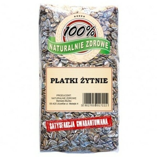 Spróbuj płatków z pełnego ziarna żyta!Płatki żytnie są wytwarzane z ziaren żyta, które po obłuskaniu i uprażeniu dodatkowo ulegają sprasowaniu. Stąd bierze się ich kształt, cienkich i szerokich płatków. Co za tym idzie, posiadają wartości odżywcze pełnego ziarna oraz gwarantują posiłkom smak i konsystencję. Przypadną do gustu zwłaszcza sportowcom oraz osobom aktywnym fizycznie a także wszystkim będącym na diecie redukcyjnej – dzięki dużej zawartości błonnika pomagają na długo zaspokoić uczucie głodu, a także usprawniają proces trawienia pomagając w lepszej przemianie materii.Na śniadanie i nie tylkoKiedy i jak najlepiej jeść płatki żytnie? Owsianka, jogurt czy mleko na śniadanie to chyba najbardziej popularne propozycje. Z dodatkiem owoców, orzechów czy miodu sprawią, że będą one idealną podstawą pożywnego śniadania. Solidna porcja węglowodanów złożonych to odpowiednia dawka energii na dobry początek dnia.Płatki doskonale sprawdzą się także jako dodatek do racuchów, placków, deserów i fit batonów. Dodaj płatki żytnie do domowego chleba, a zyska on dodatkowe walory smakowe i zdrowotne. Ze względu na swoją uniwersalność płatki żytnie można dodawać praktycznie do wszystkiego łącznie z zupami, gulaszami, a nawet ciastami i ciasteczkami w wersji słodkiej i wytrawnej.Płatki żytnie – wartościowe i smaczneCo warto włączyć do swojego jadłospisu? Z pewnością płatki żytnie! Wartość odżywcza tego produktu są nieocenione – płatki żytnie zawierają m.in. witaminy z grupy B i E, do tego magnez, fosfor i wapń. Nie bez znaczenia jest również niska liczba kalorii, która w tym przypadku jest najniższa wśród wszystkich płatków zbożowych. W połączeniu ze wspomnianym już błonnikiem daje idealny produkt dla osób walczących z nadmiernymi kilogramami. Warto też wymienić obecność lignanów, które regulują gospodarkę hormonalną oraz zmniejszają ryzyko zachorowania na raka piersi.Płatki żytnie dostępne w Naturalnie Zdrowe to pyszna i atrakcyjna cenowo alternatywa dla płatków ze zbędnymi dodatkami, które można spotkać na półkach sklepowych. Skład : płatki żytnie 100%Kraj pochodzenia : PolskaMasa netto : 1kg Produkt zawiera gluten pochodzący ze zbóż może zawierać śladowe ilości soi i sezamuData przydatności , kraj pochodzenia i numer partii towaru znajdują się na opakowaniuPrzechowywać szczelnie zamknięte w suchym i chłodnym miejscuOpakowanie może różnić się wyglądem w zależności od partii towaru Wartość odżywcza w 100g produktuWartość energetyczna1527kJ (362kcal)Tłuszcz 3,2 gw tym kwasy tłuszczowe nasycone0,9 gWęglowodany 71,0 gw tym cukry9,5 gBłonnik12,0 gBiałko6,4 gSól0,7 g PRODUCENT: NATURALNIE ZDROWE Barbara Bućko 05-420 Józefów ul. Matejki 4