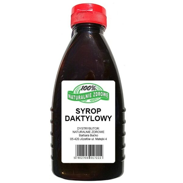 Syrop daktylowy pozyskiwany jest z daktyli – owoców palmy daktylowej. Dzięki temu ma skład podobny do świeżych owoców i słodki smak. Z tego powodu syrop z daktyli z powodzeniem może zastąpić biały cukier! Stanie się jego zdrowszą alternatywą.Syrop daktylowy – nie tylko do deserówSyropu daktylowego możesz użyć podczas przygotowania sosów – zarówno do deserów, jak i dań głównych. Doskonale zastąpi używany na co dzień biały cukier. Dodanie syropu daktylowego do wypieków sprawi, że będą wilgotne. Nada im także pięknego aromatu i mnóstwa słodyczy.Syrop daktylowy – źródło energii i witaminDaktylowy syrop jest nie tylko słodkim źródłem energii, ale także witamin i składników mineralnych. Wszystko to dzięki owocom, z których jest pozyskiwany. W jego składzie można odnaleźć witaminy: A, C, E. Ich przeciwutleniające właściwości pomagają utrzymać ciało w świetnej kondycji. Ponadto składniki mineralne takie jak potas czy magnez wspierają pracę układu krwionośnego i nerwowego. Syrop daktylowy nie jest polecany osobom z cukrzycą i IBS.W zakładzie wykorzystywane są surowce zawierające: gluten, sezam, różne orzechy. Data przydatności i numer partii towaru znajdują się na opakowaniu. Przechowywać szczelnie zamknięte w suchym i chłodnym miejscu. Opakowanie może różnić się wyglądem w zależności od partii towaru.Wartość odżywcza w 100 g produktu:Wartość energetyczna1325 kJ / 315 kcalWęglowodanyW tym cukry77,68 g70,12 gTłuszczeW tym tłuszcze nasycone< 0,1 g0 gBiałko2,2 gSól0,4 gDystrybucja: NATURALNIE ZDROWE Barbara Bućko 05-420 Józefów ul. Matejki 4