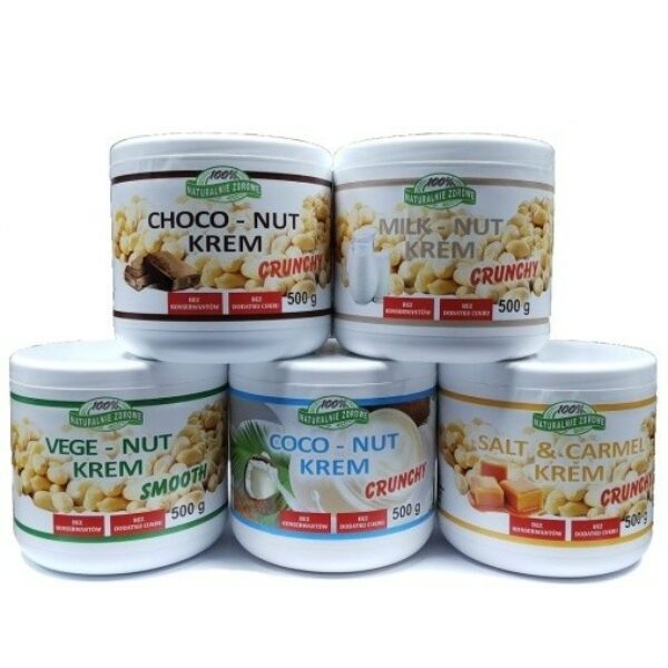 Kremy orzechowe od Naturalnie Zdrowe to świetna propozycja dla wszystkich osób aktywnych fizycznie, dbających o szczupłą sylwetkę i czytających uważnie etykiety. Bazę do naszych kremów stanowią orzeszki ziemne i pod względem chociażby konsystencji kremy są bardzo zbliżone do typowego masła orzechowego. Nasza propozycja to zdrowsza alternatywa dla popularnych kremów czekoladowych dostępnych w sklepach. Kremy Naturalnie Zdrowe to pyszne smarowidło charakteryzujące się jednocześnie dobrej jakości składem. W naszych kremach nie znajdują się żadne zbędne dodatki w postaci oleju palmowego, a cukier został zastąpiony zdrowszymi zamiennikami w postaci maltitolu i erytrolu. Kremy idealnie sprawdzą się jako pasta do kanapek, naleśników czy omletów. Można je też kłaść na wafle ryżowe czy po prostu spożywać na surowo jako rodzaj słodkiej przekąski. Nie trzeba się przy tym martwić o przybranie na wadze - sugerowana porcja to tylko 150 kcal. Spróbuj już dziś!Zestaw 5 kremów zawiera w sobie po jednym opakowaniu każdego ze smaków:mleczno-orzechowysłony karmelkokosowyczekoladowyczekoladowy w wersji vege