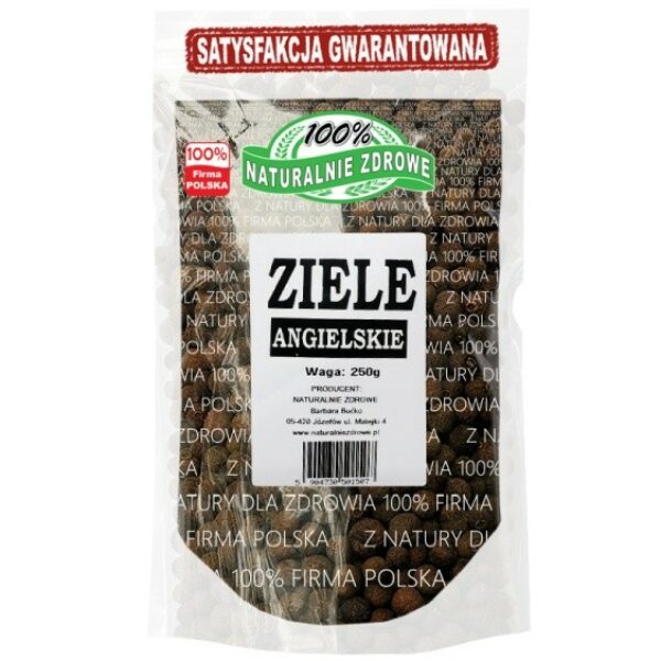 Wbrew pozorom popularne ziele angielskie nie ma wiele wspólnego z Anglią. Przyprawa znana też jako pimenta (pieprz po portugalsku), pochodzi z regionu Ameryki Środkowej i do Europy trafiła dopiero po odkryciach Kolumba. Pierwotnie była uważana za odmianę pieprzu i takiego też określenia używano – pieprz pachnący, pieprz angielski. Rodzima nazwa tej przyprawy wzięła się z faktu, że do Polski była sprowadzana właśnie z Wysp Brytyjskich i w przeszłości można było spotkać również nazwę angielskie ziarno.Ziele angielskie - kulki smakuZiele angielskie ma postać małych, ciemnych kulek. Są to owoce korzennika lekarskiego. Roślina obecnie rozpowszechniona jest w wielu krajach strefy międzyzwrotnikowej. Tropikalny klimat Indii i Karaibów sprzyja uprawie tych wysokich i wiecznie zielonych drzew. Zbiory odbywają się, gdy owoce nie są jeszcze w pełni dojrzałe, a następnie poddaje się je suszeniu dzięki czemu finalnie podobne są do ziaren pieprzu.Ze względu na dużą ilość związków eterycznych używa się ziela dla uzyskania ostrzejszego i słodszego posmaku oraz aromatu. Wykorzystanie tej przyprawy jest bardzo szerokie. Powszechnie dodaje się ziaren ziela angielskiego w czasie przygotowywania wędlin, wszelkiego rodzaju marynat czy zup. Często kilka kulek znajduje się również w przepisach na ogórki konserwowe, sałatki, a nawet kompoty owocowe. Jest jednym z głównych składników bardzo popularnego sosu grillowego – barbecue.Ziele angielskie - ulga dla żołądkaJak większość przypraw, tak i ziele angielskie ziarno to nie tylko wzbogacenie smaków, ale też korzyści zdrowotne. Jako roślina lecznicza jest wykorzystywana w dolegliwościach układu pokarmowego. Pomaga przy wzdęciach i kolkach. Należy jednak pamiętać o umiarze, zbyt duża ilość ziela angielskiego może spowodować sensacje żołądkowe. Przyprawa działa też odkażająco i przeciwbólowo, szczególnie w przypadku stawów i mięśni. Ziele wzmacnia odporność i może okazać się pomocna w okresie zwiększonych zachorowań. O dziwo, ziele angielskie może być też stosowane w kosmetyce – właściwości przyprawy łagodzą podrażnienia i hamują stany zapalne. Ziele angielskie poprawia również regenerację cery i włosów.Prócz wspomnianych dolegliwości pokarmowych, nie stwierdzono przeciwwskazań odnośnie spożywania. Jedynie kobiety w ciąży powinny wcześniej skonsultować się z lekarzem specjalistą. Ziele angielskie ziarno dostępne w Naturalnie Zdrowe to najwyższej jakość przyprawa, której nie może zabraknąć w twojej kuchni.W zakładzie wykorzystywane są surowce zawierające: gluten, sezam, różne orzechy.Data przydatności i numer partii towaru znajdują się na opakowaniu.Przechowywać szczelnie zamknięte w suchym i chłodnym miejscu.Opakowanie może różnić się wyglądem w zależności od partii towaru.Kraj pochodzenia: MeksykOpakowania 500g i 1kg to wielokrotność 250g.Producent: Naturalnie Zdrowe